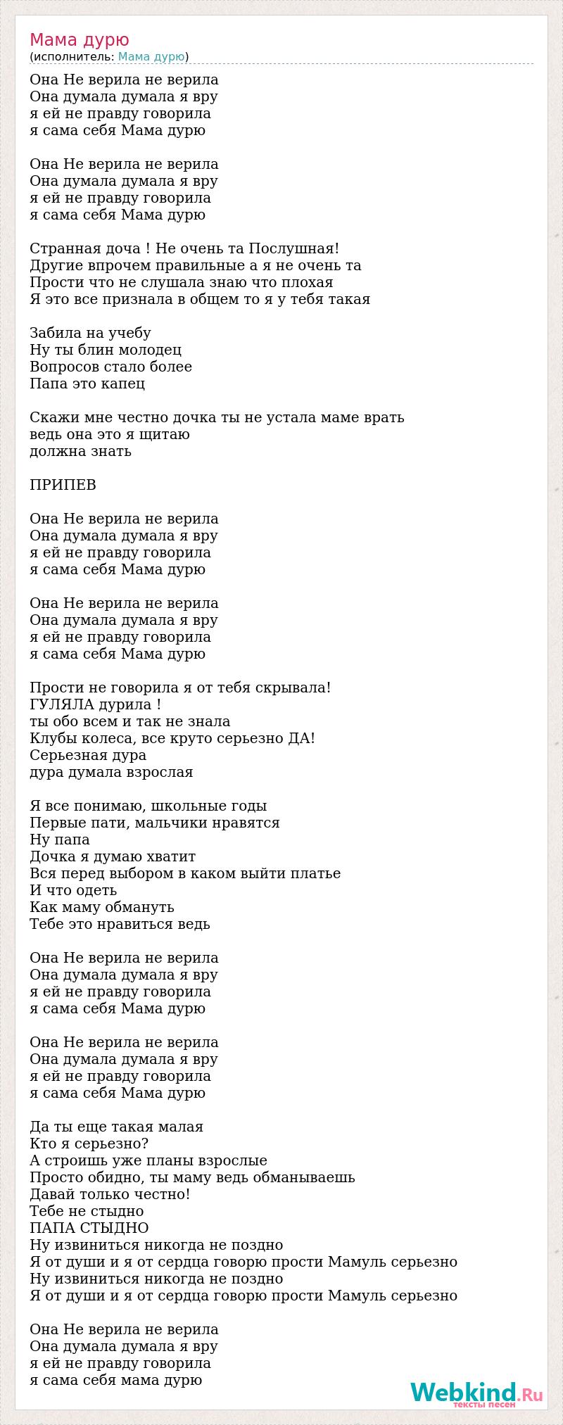 Она Не верила не верила Она думала думала я вру я ей не правду говорила я сама себя Мама дурю Она Не верила не верила Она думала думала я вру я ей не правду говорила я сама себя Мама дурю Странная доча ! Не очень та Послушная! Другие впрочем правильные а я не очень та Прости что не слушала знаю что плохая Я это все признала в общем то я у тебя такая Забила на учебу Ну ты блин молодец Вопросов стало более Папа это капец Скажи мне честно дочка ты не устала маме врать ведь она это я щитаю должна знать ПРИПЕВ Она Не верила не верила Она думала думала я вру я ей не правду говорила я сама себя Мама дурю Она Не верила не верила Она думала думала я вру я ей не правду говорила я сама себя Мама дурю Прости не говорила я от тебя скрывала! ГУЛЯЛА дурила ! ты обо всем и так не знала Клубы колеса, все круто серьезно ДА! Серьезная дура дура думала взрослая Я все понимаю, школьные годы Первые пати, мальчики нравятся Ну папа Дочка я думаю хватит Вся перед выбором в каком выйти платье И что одеть Как маму обмануть Тебе это нравиться ведь Она Не верила не верила Она думала думала я вру я ей не правду говорила я сама себя Мама дурю Она Не верила не верила Она думала думала я вру я ей не правду говорила я сама себя Мама дурю Да ты еще такая малая Кто я серьезно? А строишь уже планы взрослые Просто обидно, ты маму ведь обманываешь Давай только честно! Тебе не стыдно ПАПА СТЫДНО Ну извиниться никогда не поздно Я от души и я от сердца говорю прости Мамуль серьезно Ну извиниться никогда не поздно Я от души и я от сердца говорю прости Мамуль серьезно Она Не верила не верила Она думала думала я вру я ей не правду говорила я сама себя мама дурю