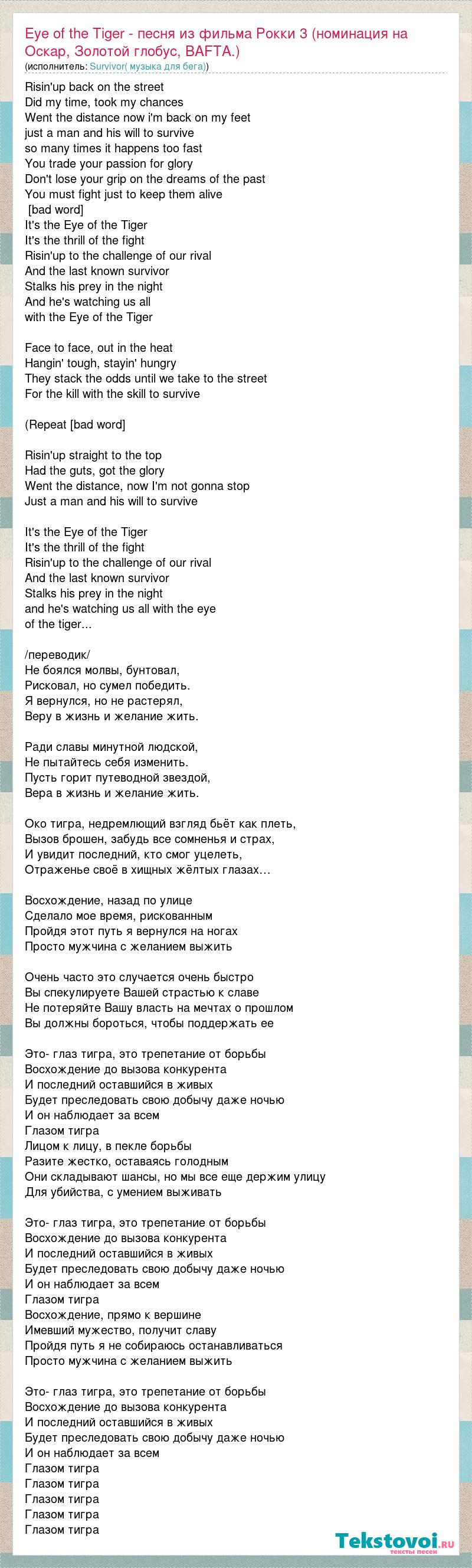 Risin'up back on the street Did my time, took my chances Went the distance now i'm back on my feet just a man and his will to survive so many times it happens too fast You trade your passion for glory Don't lose your grip on the dreams of the past You must fight just to keep them alive (Chorus) It's the Eye of the Tiger It's the thrill of the fight Risin'up to the challenge of our rival And the last known survivor Stalks his prey in the night And he's watching us all with the Eye of the Tiger Face to face, out in the heat Hangin' tough, stayin' hungry They stack the odds until we take to the street For the kill with the skill to survive (Repeat Chorus) Risin'up straight to the top Had the guts, got the glory Went the distance, now I'm not gonna stop Just a man and his will to survive It's the Eye of the Tiger It's the thrill of the fight Risin'up to the challenge of our rival And the last known survivor Stalks his prey in the night and he's watching us all with the eye of the tiger... /переводик/ Не боялся молвы, бунтовал, Рисковал, но сумел победить. Я вернулся, но не растерял, Веру в жизнь и желание жить. Ради славы минутной людской, Не пытайтесь себя изменить. Пусть горит путеводной звездой, Вера в жизнь и желание жить. Око тигра, недремлющий взгляд бьёт как плеть, Вызов брошен, забудь все сомненья и страх, И увидит последний, кто смог уцелеть, Отраженье своё в хищных жёлтых глазах… Восхождение, назад по улице Сделало мое время, рискованным Пройдя этот путь я вернулся на ногах Просто мужчина с желанием выжить Очень часто это случается очень быстро Вы спекулируете Вашей страстью к славе Не потеряйте Вашу власть на мечтах о прошлом Вы должны бороться, чтобы поддержать ее Это- глаз тигра, это трепетание от борьбы Восхождение до вызова конкурента И последний оставшийся в живых Будет преследовать свою добычу даже ночью И он наблюдает за всем Глазом тигра Лицом к лицу, в пекле борьбы Разите жестко, оставаясь голодным Они складывают шансы, но мы все еще держим улицу Для убийства, с умением выживать Это- глаз тигра, это трепетание от борьбы Восхождение до вызова конкурента И последний оставшийся в живых Будет преследовать свою добычу даже ночью И он наблюдает за всем Глазом тигра Восхождение, прямо к вершине Имевший мужество, получит славу Пройдя путь я не собираюсь останавливаться Просто мужчина с желанием выжить Это- глаз тигра, это трепетание от борьбы Восхождение до вызова конкурента И последний оставшийся в живых Будет преследовать свою добычу даже ночью И он наблюдает за всем Глазом тигра Глазом тигра Глазом тигра Глазом тигра Глазом тигра