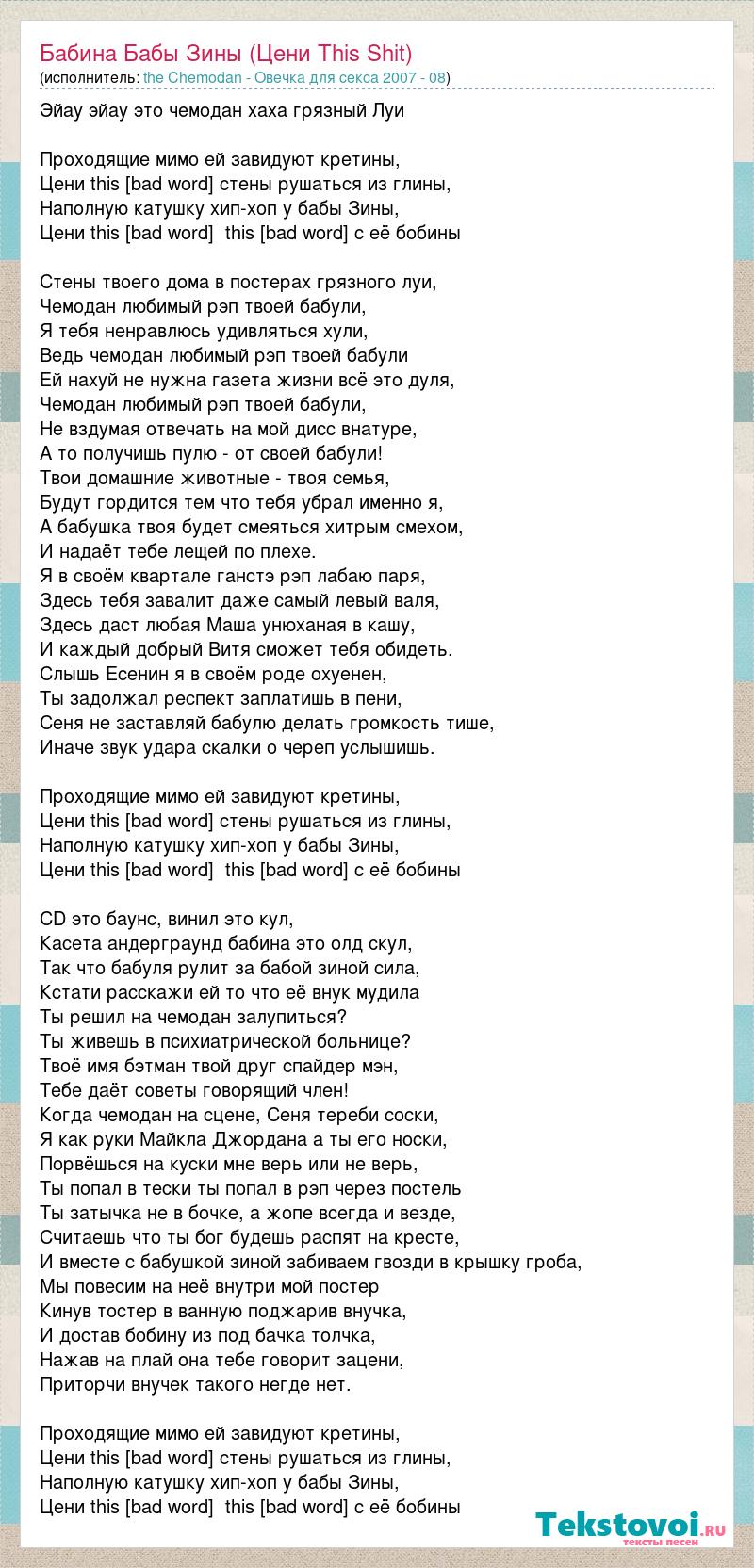 Эйау эйау это чемодан хаха грязный Луи Проходящие мимо ей завидуют кретины, Цени this [bad word] стены рушаться из глины, Наполную катушку хип-хоп у бабы Зины, Цени this [bad word] this [bad word] с её бобины Стены твоего дома в постерах грязного луи, Чемодан любимый рэп твоей бабули, Я тебя ненравлюсь удивляться хули, Ведь чемодан любимый рэп твоей бабули Ей нахуй не нужна газета жизни всё это дуля, Чемодан любимый рэп твоей бабули, Не вздумая отвечать на мой дисс внатуре, А то получишь пулю - от своей бабули! Твои домашние животные - твоя семья, Будут гордится тем что тебя убрал именно я, А бабушка твоя будет смеяться хитрым смехом, И надаёт тебе лещей по плехе. Я в своём квартале ганстэ рэп лабаю паря, Здесь тебя завалит даже самый левый валя, Здесь даст любая Маша унюханая в кашу, И каждый добрый Витя сможет тебя обидеть. Слышь Есенин я в своём роде охуенен, Ты задолжал респект заплатишь в пени, Сеня не заставляй бабулю делать громкость тише, Иначе звук удара скалки о череп услышишь. Проходящие мимо ей завидуют кретины, Цени this [bad word] стены рушаться из глины, Наполную катушку хип-хоп у бабы Зины, Цени this [bad word] this [bad word] с её бобины CD это баунc, винил это кул, Касета андерграунд бабина это олд скул, Так что бабуля рулит за бабой зиной сила, Кстати расскажи ей то что её внук мудила Ты решил на чемодан залупиться? Ты живешь в психиатрической больнице? Твоё имя бэтман твой друг спайдер мэн, Тебе даёт советы говорящий член! Когда чемодан на сцене, Сеня тереби соски, Я как руки Майкла Джордана а ты его носки, Порвёшься на куски мне верь или не верь, Ты попал в тески ты попал в рэп через постель Ты затычка не в бочке, а жопе всегда и везде, Считаешь что ты бог будешь распят на кресте, И вместе с бабушкой зиной забиваем гвозди в крышку гроба, Мы повесим на неё внутри мой постер Кинув тостер в ванную поджарив внучка, И достав бобину из под бачка толчка, Нажав на плай она тебе говорит зацени, Приторчи внучек такого негде нет. Проходящие мимо ей завидуют кретины, Цени this [bad word] стены рушаться из глины, Наполную катушку хип-хоп у бабы Зины, Цени this [bad word] this [bad word] с её бобины