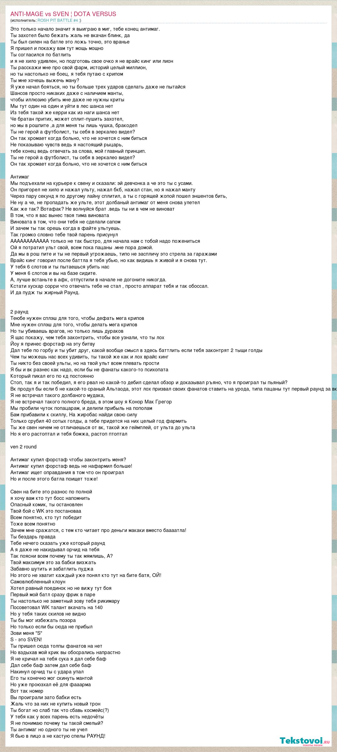 Это только начало значит я выиграю в миг, тебе конец антимаг. Ты захотел было бежать жаль не вкачан блинк, да Ты был силен на батле это ложь точно, это вранье Я пришел и покажу вам тут мощь мощно Ты согласился по батлить и я не хило удивлен, но подготовь свое очко я не врайс кинг или лион Ты расскажи мне про свой фарм, историй целый миллион, но ты настолько не боец, я тебя путаю с крипом Ты мне хочешь выжечь ману? Я уже начал бояться, но ты больше трех ударов сделать даже не пытайся Шансов просто никаких даже с наличием манты, чтобы иллюзию убить мне даже не нужны криты Мы тут один на один и уйти в лес шанса нет Из тебя такой же керри как из наги шанса нет Че братан притих, может сплит-пушить захотел, но мы в рошпите ,а для меня ты лишь чушка, бракодел Ты не герой а футболист, ты себя в зеркалео видел? Он так хромает когда больно, что не хочется с ним биться Не показываю чувств ведь я настоящий рыцарь, тебе конец ведь отвечать за слова, мой главный принцип. Ты не герой а футболист, ты себя в зеркалео видел? Он так хромает когда больно, что не хочется с ним биться Антимаг Мы подъехали на курьере к свену и сказали: эй девчонка а че это ты с усами. Он пригорел не хило и нажал ульту, нажал бкб, нажал стан, но я нажал манту Через пару секунд я по другому лайну сплитил, а ты с горящей жопой пошел эншентов бить, Не ну а че, не пропадать же ульте, этот долбаный антимаг от меня снова улетел Как же так? Вотафак? Не волнуйся брат .ведь ты ни в чем не виноват В том, что я вас вынес твоя тима виновата Виновата в том, что они тебя не сделали сапом И зачем ты так орешь когда в файте ультуешь. Так громко словно тебе твой парень присунул АААААААААААА только не так быстро, для начала нам с тобой надо пожениться Ой я потратил ульт свой, всем пока пацаны .мне пора домой. Да мы в рош пите и ты не первый угрожаешь, типо не заспличу это стрела за гаражами Врайс кинг говорил после баттла я тебя убью, но как видишь я живой и я снова тут. У тебя 6 слотов и ты пытаешься убить нас У меня 6 слотов и вы на базе сидите. А, лучше встаньте в афк, отпустили в начале не догоните никогда. Кстати хускар сорри что отвечать тебе не стал , просто аппарат тебя и так обоссал. И да пудж ты жирный Раунд. 2 раунд Теюбе нужен сплэш для того, чтобы дефать мега крипов Мне нужен сплэш для того, чтобы делать мега крипов Но ты убиваешь врагов, но только лишь дураков Я щас покажу, чем тебя законтрить, чтобы все узнали, что ты лох Йоу я принес форстаф на эту битву Дал тебе по горбу и ты убит друг, какой вообще смысл в здесь баттлить если тебя законтрят 2 тыщи голды Чем ты можешь нас всех удивить, ты такой же как и лох врайс кинг Ты никто без своей ульты, но на твой ульт всем плевать прости Я бы и вк разнес как надо, если бы не фанаты какого-то психопата Который пикал его по кд постоянно Стоп, так я и так победил, я его рвал но какой-то дебил сделал обзор и доказывал ръяно, что я проиграл ты пьяный? Вк продул бы если б не какой-то сраный Альтаода, этот лох призвал своих фанатов ставить на урода, типа пацаны тут первый раунд за вк Я не встречал такого долбаного мудака, Я не встречал такого полного бреда, в этом шоу я Конор Мак Грегор Мы пробили чуток попацарам, и делили прибыль на пополам Бам прибавили к скиллу, На жиробас найди свою силу Только срубил 40 сотых голды, а тебе придется на них целый год фармить Ты же свен ничем не отличаешься от вк, такой же 
