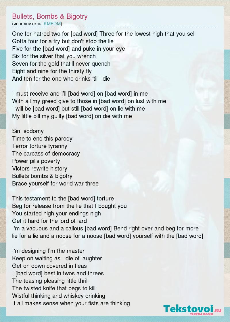 One for hatred two for hell Three for the lowest high that you sell Gotta four for a try but don't stop the lie Five for the [bad word] and puke in your eye Six for the silver that you wrench Seven for the gold that'll never quench Eight and nine for the thirsty fly And ten for the one who drinks 'til I die I must receive and I’ll believe Come on trust in me With all my greed give to those in need Come on lust with me I will be true but still deceive Come on lie with me My little pill my guilty thrill Come on die with me Sin sodomy Time to end this parody Terror torture tyranny The carcass of democracy Power pills poverty Victors rewrite history Bullets bombs & bigotry Brace yourself for world war three This testament to the truest torture Beg for release from the lie that I bought you You started high your endings nigh Get it hard for the lord of lard I'm a vacuous and a callous [bad word] Bend right over and beg for more lie for a lie and a noose for a noose Don't complicate yourself with the truth I'm designing I’m the master Keep on waiting as I die of laughter Get on down covered in fleas I [bad word] best in twos and threes The teasing pleasing little thrill The twisted knife that begs to kill Wistful thinking and whiskey drinking It all makes sense when your fists are thinking
