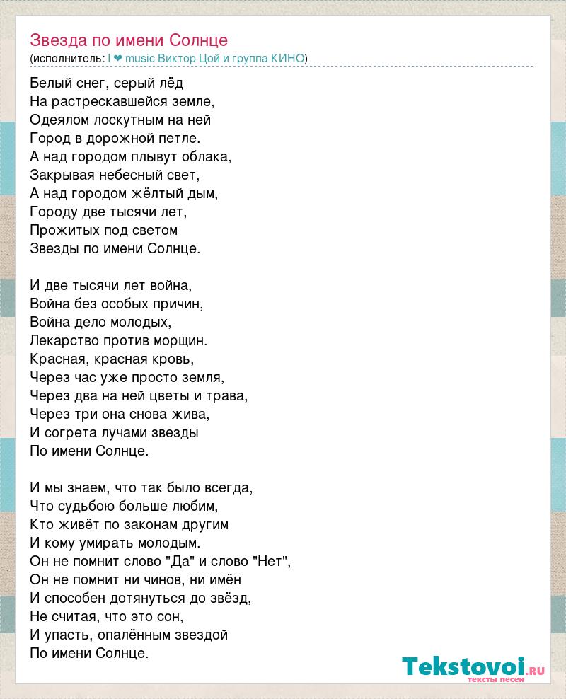 Белый снег, серый лёд На растрескавшейся земле, Одеялом лоскутным на ней Город в дорожной петле. А над городом плывут облака, Закрывая небесный свет, А над городом жёлтый дым, Городу две тысячи лет, Прожитых под светом Звезды по имени Солнце. И две тысячи лет война, Война без особых причин, Война дело молодых, Лекарство против морщин. Красная, красная кровь, Через час уже просто земля, Через два на ней цветы и трава, Через три она снова жива, И согрета лучами звезды По имени Солнце. И мы знаем, что так было всегда, Что судьбою больше любим, Кто живёт по законам другим И кому умирать молодым. Он не помнит слово "Да" и слово "Нет", Он не помнит ни чинов, ни имён И способен дотянуться до звёзд, Не считая, что это сон, И упасть, опалённым звездой По имени Солнце.