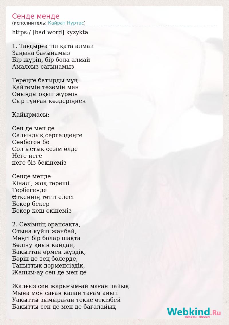 https:/ [bad word] kyzykta 1. Тағдырға тiл қата алмай Заңына бағынамыз Бip жүріп, бip бола алмай Амалсыз сағынамыз Тереңге батырды мұң Қайтемiн төземін мен Ойыңды оқып жүрмін Сыр тұнған көздеріңнен Қайырмасы: Сен де мен де Салындық сергелдеңге Сөнбеген бе Сол ыстық сезім әлде Неге неге неге бiз бекінемiз Сенде менде Кiналi, жоқ төреші Тербегенде Өткеннің тәтті елесi Бекер бекер Бекер кеш өкінеміз 2. Сезімнің орансақта, Отына күйiп жанбай, Мəңгі бір болар шақта Бөліну қиын кандай, Бақыттан əрмен жүздік, Бəрін де тең бөлерде, Таныттык дəрменсіздік, Жаным-ау сен де мен де Жалғыз сен жарығым-ай маған лайық Мына мен саған қалай тағам айып Уақытты зымыраған текке өткізбей Бақытты сен де мен де бағалайық