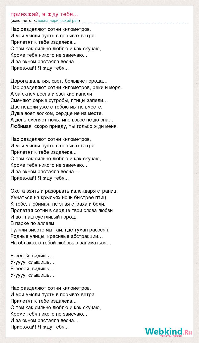 Нас разделяют сотни километров, И мои мысли пусть в порывах ветра Прилетят к тебе издалека... О том как сильно люблю и как скучаю, Кроме тебя никого не замечаю... И за окном растаяла весна... Приезжай! Я жду тебя... Дорога дальняя, свет, большие города… Нас разделяют сотни километров, реки и моря. А за окном весна и звонкие капели Сменяют серые сугробы, птицы запели… Две недели уже с тобою мы не вместе, Душа воет волком, сердце не на месте. А день сменяет ночь, мне вовсе не до сна… Любимая, скоро приеду, ты только жди меня. Нас разделяют сотни километров, И мои мысли пусть в порывах ветра Прилетят к тебе издалека... О том как сильно люблю и как скучаю, Кроме тебя никого не замечаю... И за окном растаяла весна... Приезжай! Я жду тебя... Охота взять и разорвать календаря страниц, Умчаться на крыльях ночи быстрее птиц. К тебе, любимая, не зная страха и боли, Пролетая сотни в сердце твои слова любви И вот наш суетливый город, В парке по аллеям Гуляли вместе мы там, где туман рассеян, Родные улицы, красивые абстракции… На облаках с тобой любовью заниматься… Е-еееей, видишь… У-уууу, слышишь… Е-еееей, видишь… У-уууу, слышишь… Нас разделяют сотни километров, И мои мысли пусть в порывах ветра Прилетят к тебе издалека... О том как сильно люблю и как скучаю, Кроме тебя никого не замечаю... И за окном растаяла весна... Приезжай! Я жду тебя...