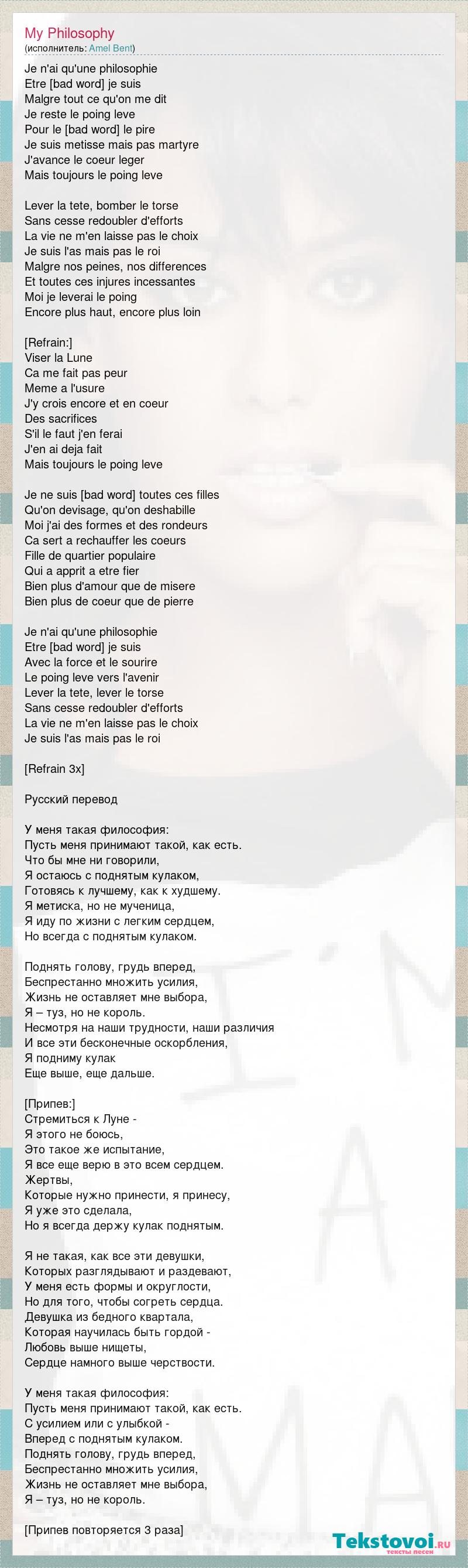 Je n'ai qu'une philosophie Etre [bad word] je suis Malgre tout ce qu'on me dit Je reste le poing leve Pour le [bad word] le pire Je suis metisse mais pas martyre J'avance le coeur leger Mais toujours le poing leve Lever la tete, bomber le torse Sans cesse redoubler d'efforts La vie ne m'en laisse pas le choix Je suis l'as mais pas le roi Malgre nos peines, nos differences Et toutes ces injures incessantes Moi je leverai le poing Encore plus haut, encore plus loin [Refrain:] Viser la Lune Ca me fait pas peur Meme a l'usure J'y crois encore et en coeur Des sacrifices S'il le faut j'en ferai J'en ai deja fait Mais toujours le poing leve Je ne suis [bad word] toutes ces filles Qu'on devisage, qu'on deshabille Moi j'ai des formes et des rondeurs Ca sert a rechauffer les coeurs Fille de quartier populaire Qui a apprit a etre fier Bien plus d'amour que de misere Bien plus de coeur que de pierre Je n'ai qu'une philosophie Etre [bad word] je suis Avec la force et le sourire Le poing leve vers l'avenir Lever la tete, lever le torse Sans cesse redoubler d'efforts La vie ne m'en laisse pas le choix Je suis l'as mais pas le roi [Refrain 3x] Русский перевод У меня такая философия: Пусть меня принимают такой, как есть. Что бы мне ни говорили, Я остаюсь с поднятым кулаком, Готовясь к лучшему, как к худшему. Я метиска, но не мученица, Я иду по жизни с легким сердцем, Но всегда с поднятым кулаком. Поднять голову, грудь вперед, Беспрестанно множить усилия, Жизнь не оставляет мне выбора, Я – туз, но не король. Несмотря на наши трудности, наши различия И все эти бесконечные оскорбления, Я подниму кулак Еще выше, еще дальше. [Припев:] Стремиться к Луне - Я этого не боюсь, Это такое же испытание, Я все еще верю в это всем сердцем. Жертвы, Которые нужно принести, я принесу, Я уже это сделала, Но я всегда держу кулак поднятым. Я не такая, как все эти девушки, Которых разглядывают и раздевают, У меня есть формы и округлости, Но для того, чтобы согреть сердца. Девушка из бедного квартала, Которая научилась быть гордой - Любовь выше нищеты, Сердце намного выше черствости. У меня такая философия: Пусть меня принимают такой, как есть. С усилием или с улыбкой - Вперед с поднятым кулаком. Поднять голову, грудь вперед, Беспрестанно множить усилия, Жизнь не оставляет мне выбора, Я – туз, но не король. [Припев повторяется 3 раза]
