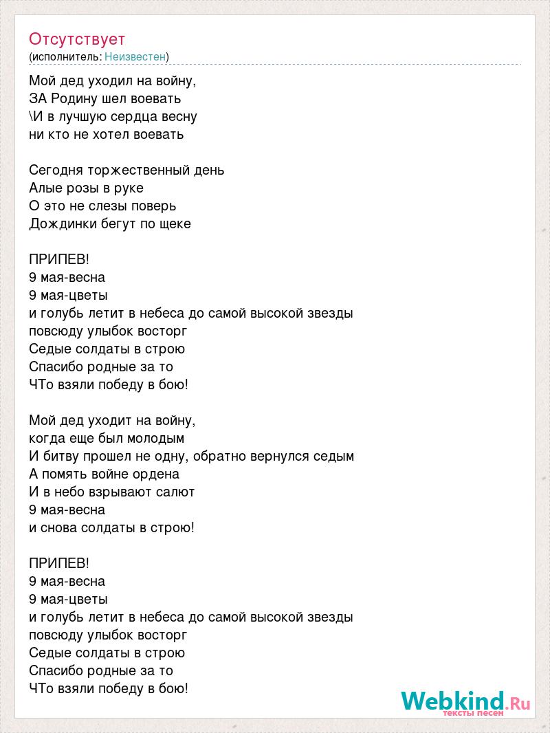 Мой дед уходил на войну, ЗА Родину шел воевать \И в лучшую сердца весну ни кто не хотел воевать Сегодня торжественный день Алые розы в руке О это не слезы поверь Дождинки бегут по щеке ПРИПЕВ! 9 мая-весна 9 мая-цветы и голубь летит в небеса до самой высокой звезды повсюду улыбок восторг Седые солдаты в строю Спасибо родные за то ЧТо взяли победу в бою! Мой дед уходит на войну, когда еще был молодым И битву прошел не одну, обратно вернулся седым А помять войне ордена И в небо взрывают салют 9 мая-весна и снова солдаты в строю! ПРИПЕВ! 9 мая-весна 9 мая-цветы и голубь летит в небеса до самой высокой звезды повсюду улыбок восторг Седые солдаты в строю Спасибо родные за то ЧТо взяли победу в бою!