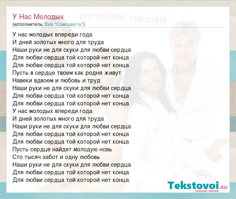 У нас молодых впереди года И дней золотых много для труда Наши руки не для скуки для любви сердца Для любви сердца той которой нет конца Для любви сердца той которой нет конца Пусть в сердце твоем как родня живут Навеки вдвоем и любовь и труд Наши руки не для скуки для любви сердца Для любви сердца той которой нет конца Для любви сердца той которой нет конца У нас молодых впереди года И дней золотых много для труда Наши руки не для скуки для любви сердца Для любви сердца той которой нет конца Для любви сердца той которой нет конца Пусть сердце найдет молодую новь Сто тысяч забот и одну любовь Наши руки не для скуки для любви сердца Для любви сердца той которой нет конца Для любви сердца той которой нет конца