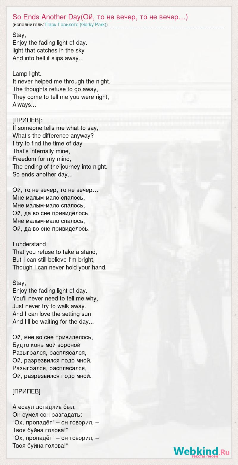 Stay, Enjoy the fading light of day. light that catches in the sky And into hell it slips away... Lamp light. It never helped me through the night. The thoughts refuse to go away, They come to tell me you were right, Always... [ПРИПЕВ]: If someone tells me what to say, What's the difference anyway? I try to find the time of day That's internally mine, Freedom for my mind, The ending of the journey into night. So ends another day... Ой, то не вечер, то не вечер… Мне малым-мало спалось, Мне малым-мало спалось, Ой, да во сне привиделось. Мне малым-мало спалось, Ой, да во сне привиделось. I understand That you refuse to take a stand, But I can still believe I'm bright, Though I can never hold your hand. Stay, Enjoy the fading light of day. You'll never need to tell me why, Just never try to walk away. And I can love the setting sun And I'll be waiting for the day... Ой, мне во сне привиделось, Будто конь мой вороной Разыгрался, расплясался, Ой, разрезвился подо мной. Разыгрался, расплясался, Ой, разрезвился подо мной. [ПРИПЕВ] А есаул догадлив был, Он сумел сон разгадать: “Ох, пропадёт” – он говорил, – Твоя буйна голова!” “Ох, пропадёт” – он говорил, – Твоя буйна голова!”