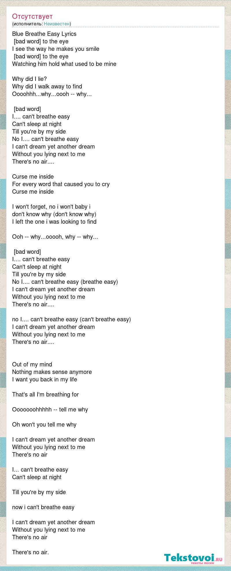 Blue Breathe Easy Lyrics Cruel to the eye I see the way he makes you smile Cruel to the eye Watching him hold what used to be mine Why did I lie? Why did I walk away to find Oooohhh...why...oooh -- why... CHORUS I.... can't breathe easy Can't sleep at night Till you're by my side No I.... can't breathe easy I can't dream yet another dream Without you lying next to me There's no air.... Curse me inside For every word that caused you to cry Curse me inside I won't forget, no i won't baby i don't know why (don't know why) I left the one i was looking to find Ooh -- why...ooooh, why -- why... CHORUS I.... can't breathe easy Can't sleep at night Till you're by my side No I.... can't breathe easy (breathe easy) I can't dream yet another dream Without you lying next to me There's no air.... no I.... can't breathe easy (can't breathe easy) I can't dream yet another dream Without you lying next to me There's no air.... Out of my mind Nothing makes sense anymore I want you back in my life That's all I'm breathing for Ooooooohhhhh -- tell me why Oh won't you tell me why I can't dream yet another dream Without you lying next to me There's no air I... can't breathe easy Can't sleep at night Till you're by my side now i can't breathe easy I can't dream yet another dream Without you lying next to me There's no air There's no air.