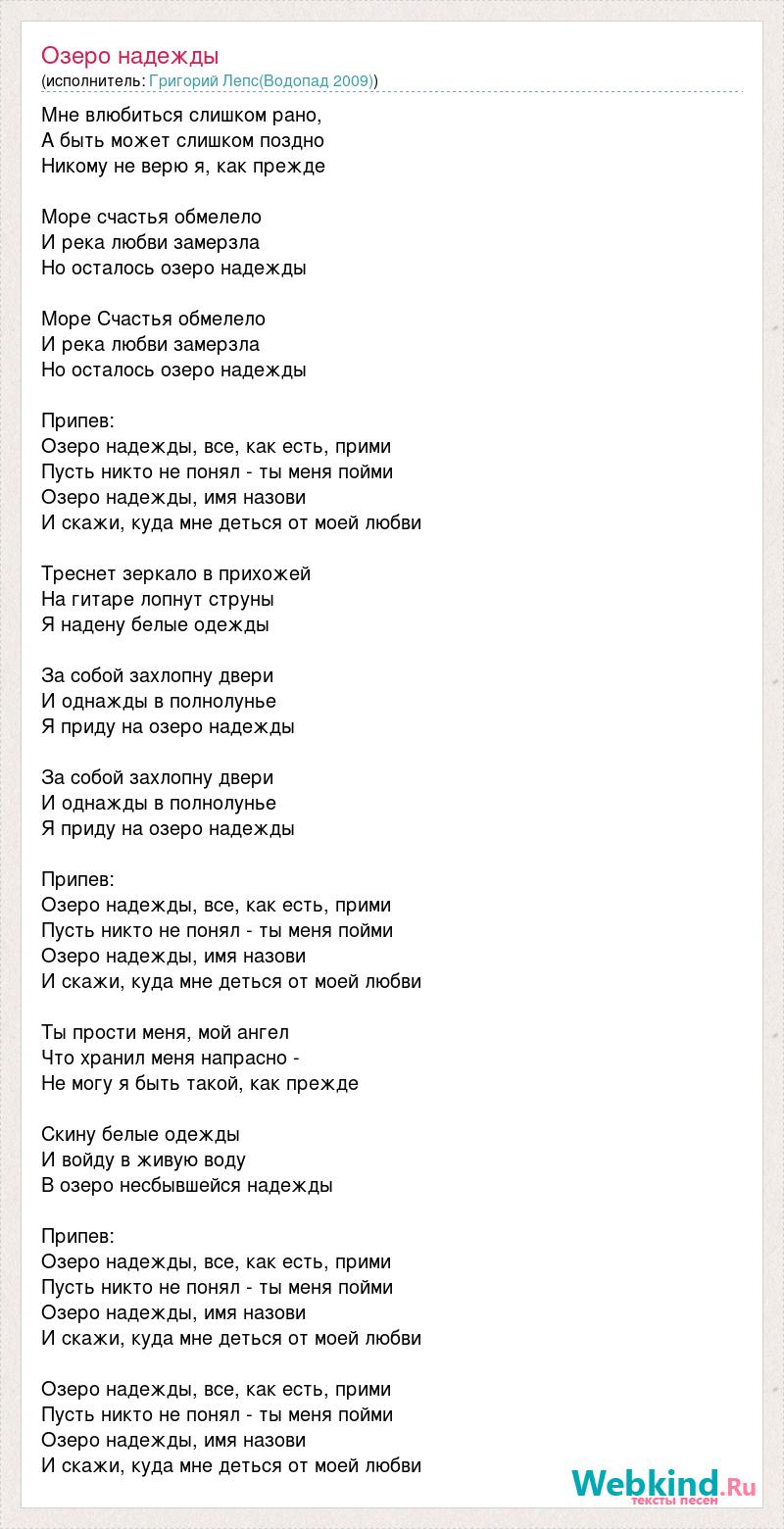 Мне влюбиться слишком рано, А быть может слишком поздно Никому не верю я, как прежде Море счастья обмелело И река любви замерзла Но осталось озеро надежды Море Счастья обмелело И река любви замерзла Но осталось озеро надежды Припев: Озеро надежды, все, как есть, прими Пусть никто не понял - ты меня пойми Озеро надежды, имя назови И скажи, куда мне деться от моей любви Треснет зеркало в прихожей На гитаре лопнут струны Я надену белые одежды За собой захлопну двери И однажды в полнолунье Я приду на озеро надежды За собой захлопну двери И однажды в полнолунье Я приду на озеро надежды Припев: Озеро надежды, все, как есть, прими Пусть никто не понял - ты меня пойми Озеро надежды, имя назови И скажи, куда мне деться от моей любви Ты прости меня, мой ангел Что хранил меня напрасно - Не могу я быть такой, как прежде Скину белые одежды И войду в живую воду В озеро несбывшейся надежды Припев: Озеро надежды, все, как есть, прими Пусть никто не понял - ты меня пойми Озеро надежды, имя назови И скажи, куда мне деться от моей любви Озеро надежды, все, как есть, прими Пусть никто не понял - ты меня пойми Озеро надежды, имя назови И скажи, куда мне деться от моей любви