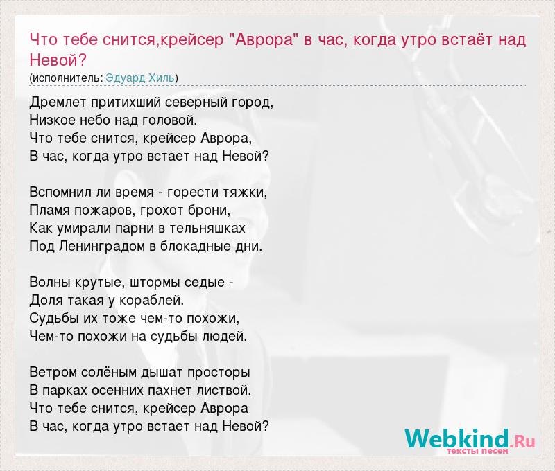Дремлет притихший северный город, Низкое небо над головой. Что тебе снится, крейсер Аврора, В час, когда утро встает над Невой? Вспомнил ли время - горести тяжки, Пламя пожаров, грохот брони, Как умирали парни в тельняшках Под Ленинградом в блокадные дни. Волны крутые, штормы седые - Доля такая у кораблей. Судьбы их тоже чем-то похожи, Чем-то похожи на судьбы людей. Ветром солёным дышат просторы В парках осенних пахнет листвой. Что тебе снится, крейсер Аврора В час, когда утро встает над Невой?