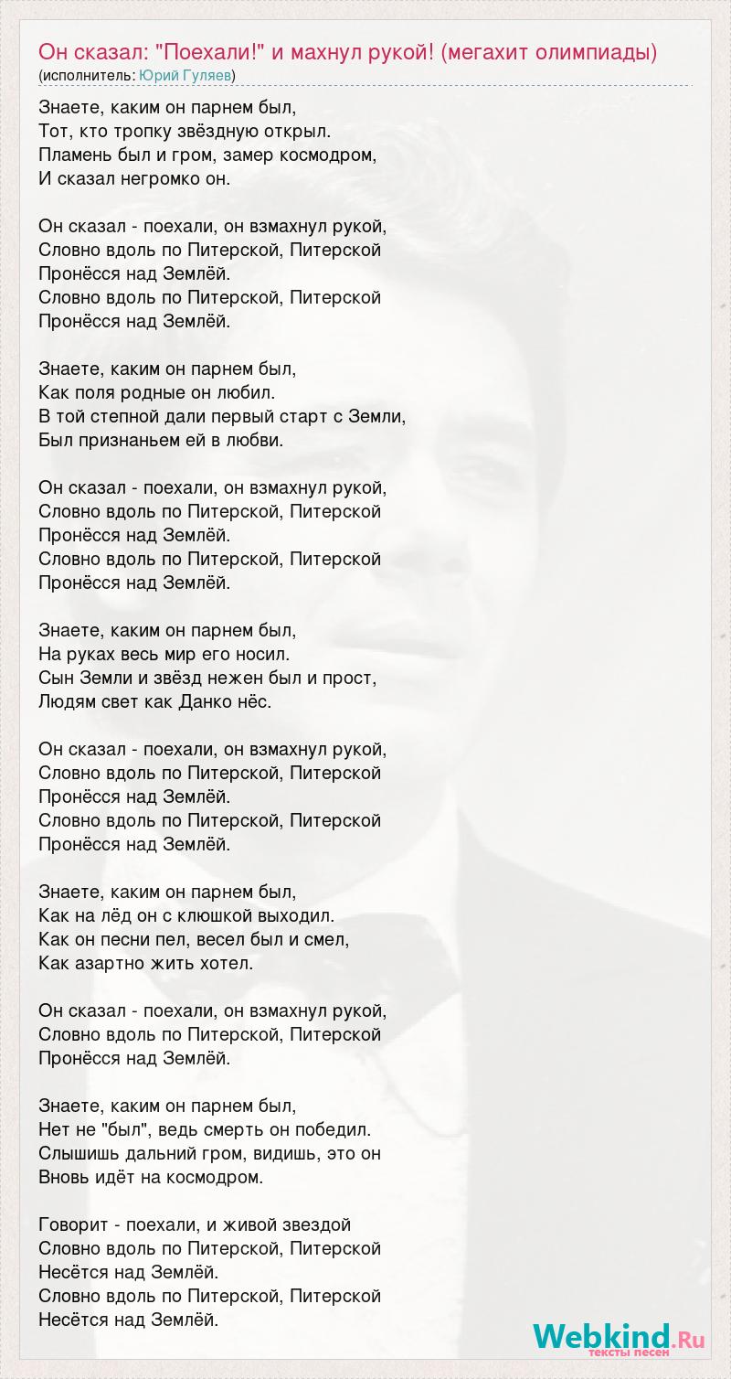 Знаете, каким он парнем был, Тот, кто тропку звёздную открыл. Пламень был и гром, замер космодром, И сказал негромко он. Он сказал - поехали, он взмахнул рукой, Словно вдоль по Питерской, Питерской Пронёсся над Землёй. Словно вдоль по Питерской, Питерской Пронёсся над Землёй. Знаете, каким он парнем был, Как поля родные он любил. В той степной дали первый старт с Земли, Был признаньем ей в любви. Он сказал - поехали, он взмахнул рукой, Словно вдоль по Питерской, Питерской Пронёсся над Землёй. Словно вдоль по Питерской, Питерской Пронёсся над Землёй. Знаете, каким он парнем был, На руках весь мир его носил. Сын Земли и звёзд нежен был и прост, Людям свет как Данко нёс. Он сказал - поехали, он взмахнул рукой, Словно вдоль по Питерской, Питерской Пронёсся над Землёй. Словно вдоль по Питерской, Питерской Пронёсся над Землёй. Знаете, каким он парнем был, Как на лёд он с клюшкой выходил. Как он песни пел, весел был и смел, Как азартно жить хотел. Он сказал - поехали, он взмахнул рукой, Словно вдоль по Питерской, Питерской Пронёсся над Землёй. Знаете, каким он парнем был, Нет не "был", ведь смерть он победил. Слышишь дальний гром, видишь, это он Вновь идёт на космодром. Говорит - поехали, и живой звездой Словно вдоль по Питерской, Питерской Несётся над Землёй. Словно вдоль по Питерской, Питерской Несётся над Землёй.