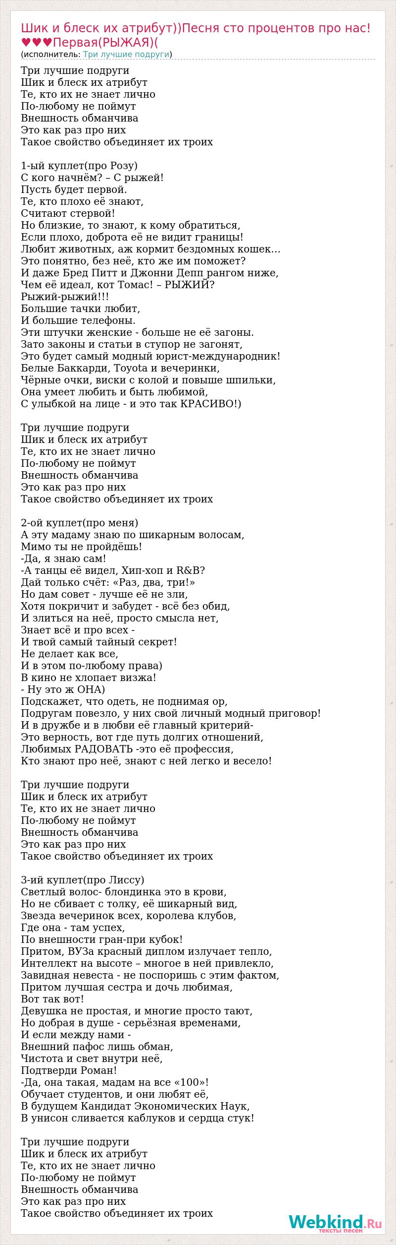 Три лучшие подруги Шик и блеск их атрибут Те, кто их не знает лично По-любому не поймут Внешность обманчива Это как раз про них Такое свойство объединяет их троих 1-ый куплет(про Розу) С кого начнём? – С рыжей! Пусть будет первой. Те, кто плохо её знают, Считают стервой! Но близкие, то знают, к кому обратиться, Если плохо, доброта её не видит границы! Любит животных, аж кормит бездомных кошек… Это понятно, без неё, кто же им поможет? И даже Бред Питт и Джонни Депп рангом ниже, Чем её идеал, кот Томас! – РЫЖИЙ? Рыжий-рыжий!!! Большие тачки любит, И большие телефоны. Эти штучки женские - больше не её загоны. Зато законы и статьи в ступор не загонят, Это будет самый модный юрист-международник! Белые Баккарди, Toyota и вечеринки, Чёрные очки, виски с колой и повыше шпильки, Она умеет любить и быть любимой, С улыбкой на лице - и это так КРАСИВО!) Три лучшие подруги Шик и блеск их атрибут Те, кто их не знает лично По-любому не поймут Внешность обманчива Это как раз про них Такое свойство объединяет их троих 2-ой куплет(про меня) А эту мадаму знаю по шикарным волосам, Мимо ты не пройдёшь! -Да, я знаю сам! -А танцы её видел, Хип-хоп и R&B? Дай только счёт: «Раз, два, три!» Но дам совет - лучше её не зли, Хотя покричит и забудет - всё без обид, И злиться на неё, просто смысла нет, Знает всё и про всех - И твой самый тайный секрет! Не делает как все, И в этом по-любому права) В кино не хлопает визжа! - Ну это ж ОНА) Подскажет, что одеть, не поднимая ор, Подругам повезло, у них свой личный модный приговор! И в дружбе и в любви её главный критерий- Это верность, вот где путь долгих отношений, Любимых РАДОВАТЬ -это её профессия, Кто знают про неё, знают с ней легко и весело! Три лучшие подруги Шик и блеск их атрибут Те, кто их не знает лично По-любому не поймут Внешность обманчива Это как раз про них Такое свойство объединяет их троих 3-ий куплет(про Лиссу) Светлый волос- блондинка это в крови, Но не сбивает с толку, её шикарный вид, Звезда вечеринок всех, королева клубов, Где она - там успех, По внешности гран-при кубок! Притом, ВУЗа красный диплом излучает тепло, Интеллект на высоте – многое в ней привлекло, Завидная невеста - не поспоришь с этим фактом, Притом лучшая сестра и дочь любимая, Вот так вот! Девушка не простая, и многие просто тают, Но добрая в душе - серьёзная временами, И если между нами - Внешний пафос лишь обман, Чистота и свет внутри неё, Подтверди Роман! -Да, она такая, мадам на все «100»! Обучает студентов, и они любят её, В будущем Кандидат Экономических Наук, В унисон сливается каблуков и сердца стук! Три лучшие подруги Шик и блеск их атрибут Те, кто их не знает лично По-любому не поймут Внешность обманчива Это как раз про них Такое свойство объединяет их троих