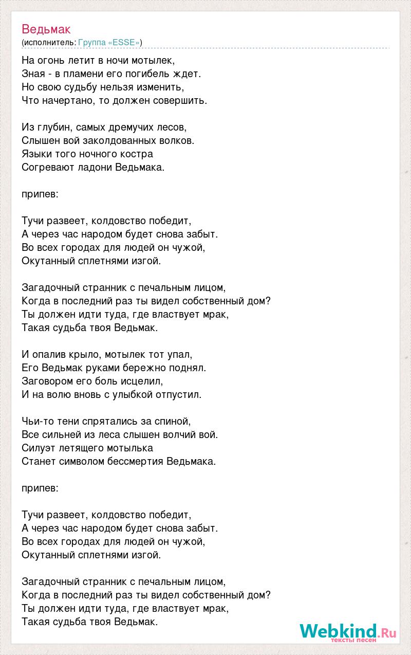 На огонь летит в ночи мотылек, Зная - в пламени его погибель ждет. Но свою судьбу нельзя изменить, Что начертано, то должен совершить. Из глубин, самых дремучих лесов, Слышен вой заколдованных волков. Языки того ночного костра Согревают ладони Ведьмака. припев: Тучи развеет, колдовство победит, А через час народом будет снова забыт. Во всех городах для людей он чужой, Окутанный сплетнями изгой. Загадочный странник с печальным лицом, Когда в последний раз ты видел собственный дом? Ты должен идти туда, где властвует мрак, Такая судьба твоя Ведьмак. И опалив крыло, мотылек тот упал, Его Ведьмак руками бережно поднял. Заговором его боль исцелил, И на волю вновь с улыбкой отпустил. Чьи-то тени спрятались за спиной, Все сильней из леса слышен волчий вой. Силуэт летящего мотылька Станет символом бессмертия Ведьмака. припев: Тучи развеет, колдовство победит, А через час народом будет снова забыт. Во всех городах для людей он чужой, Окутанный сплетнями изгой. Загадочный странник с печальным лицом, Когда в последний раз ты видел собственный дом? Ты должен идти туда, где властвует мрак, Такая судьба твоя Ведьмак.