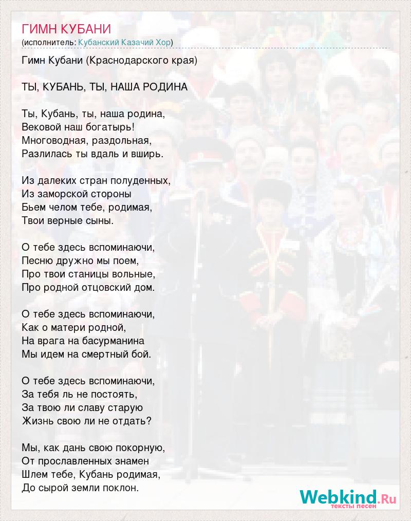 Гимн Кубани (Краснодарского края) ТЫ, КУБАНЬ, ТЫ, НАША РОДИНА Ты, Кубань, ты, наша родина, Вековой наш богатырь! Многоводная, раздольная, Разлилась ты вдаль и вширь. Из далеких стран полуденных, Из заморской стороны Бьем челом тебе, родимая, Твои верные сыны. О тебе здесь вспоминаючи, Песню дружно мы поем, Про твои станицы вольные, Про родной отцовский дом. О тебе здесь вспоминаючи, Как о матери родной, На врага на басурманина Мы идем на смертный бой. О тебе здесь вспоминаючи, За тебя ль не постоять, За твою ли славу старую Жизнь свою ли не отдать? Мы, как дань свою покорную, От прославленных знамен Шлем тебе, Кубань родимая, До сырой земли поклон.