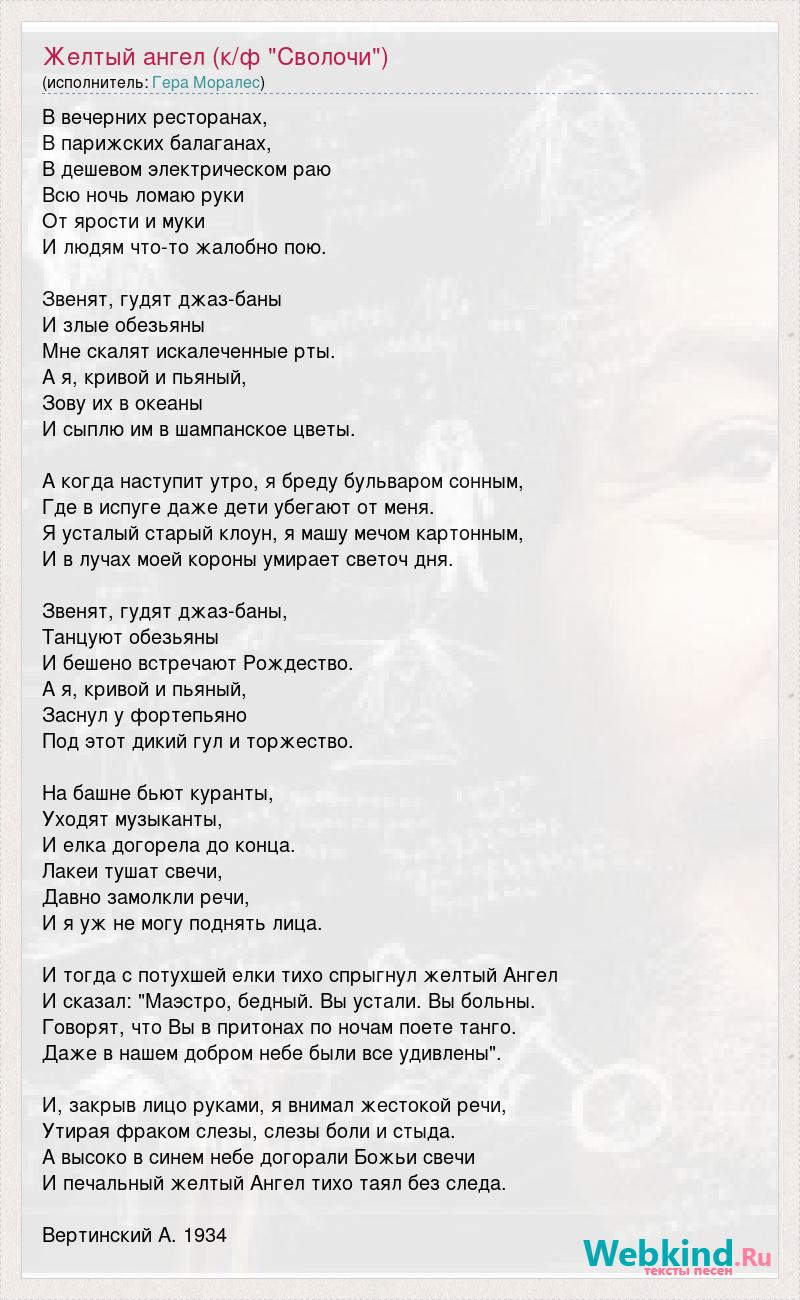 В вечерних ресторанах, В парижских балаганах, В дешевом электрическом раю Всю ночь ломаю руки От ярости и муки И людям что-то жалобно пою. Звенят, гудят джаз-баны И злые обезьяны Мне скалят искалеченные рты. А я, кривой и пьяный, Зову их в океаны И сыплю им в шампанское цветы. А когда наступит утро, я бреду бульваром сонным, Где в испуге даже дети убегают от меня. Я усталый старый клоун, я машу мечом картонным, И в лучах моей короны умирает светоч дня. Звенят, гудят джаз-баны, Танцуют обезьяны И бешено встречают Рождество. А я, кривой и пьяный, Заснул у фортепьяно Под этот дикий гул и торжество. На башне бьют куранты, Уходят музыканты, И елка догорела до конца. Лакеи тушат свечи, Давно замолкли речи, И я уж не могу поднять лица. И тогда с потухшей елки тихо спрыгнул желтый Ангел И сказал: "Маэстро, бедный. Вы устали. Вы больны. Говорят, что Вы в притонах по ночам поете танго. Даже в нашем добром небе были все удивлены". И, закрыв лицо руками, я внимал жестокой речи, Утирая фраком слезы, слезы боли и стыда. А высоко в синем небе догорали Божьи свечи И печальный желтый Ангел тихо таял без следа. Вертинский А. 1934