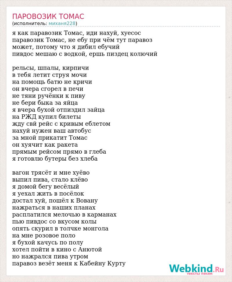 я как паравозик Томас, иди нахуй, хуесос паравозик Томас, не ебу при чём тут паравоз может, потому что я дибил ебучий пивдос мешаю с водкой, ершь пиздец колючий рельсы, шпалы, кирпичи в тебя летит струя мочи на помощь батю не кричи он вчера сгорел в печи не тяни ручёнки к пиву не бери быка за яйца я вчера бухой отпиздил зайца на РЖД купил билеты жду свй рейс с кривым еблетом нахуй нужен ваш автобус за мной прикатит Томас он хуячит как ракета прямым рейсом прямо в глеба я готовлю бутеры без хлеба вагон трясёт и мне хуёво выпил пива, стало клёво я домой бегу весёлый я уехал жить в посёлок достал хуй, пошёл к Вовану нажраться в наших планах расплатился мелочью в карманах пью пивдос со вкусом колы опять скурил в толчке монгола на мне розовое поло я бухой качусь по полу хотел пойти в кино с Анютой но нажрался пива утром паравоз везёт меня к Кабейну Курту