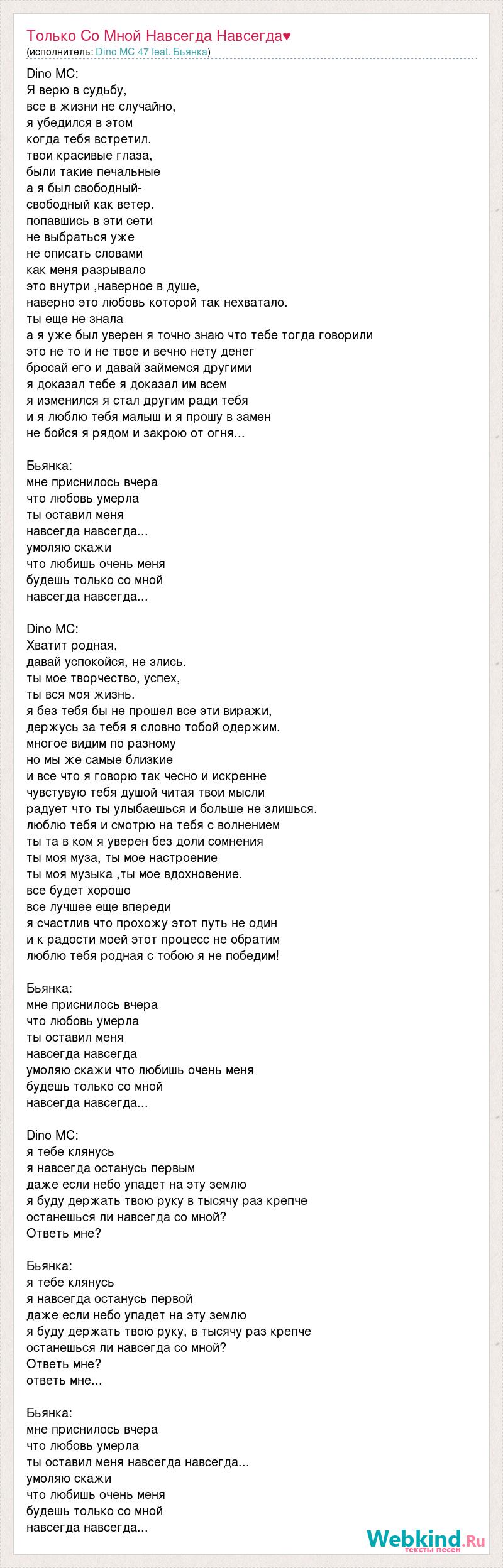 Dino МС: Я верю в судьбу, все в жизни не случайно, я убедился в этом когда тебя встретил. твои красивые глаза, были такие печальные а я был свободный- свободный как ветер. попавшись в эти сети не выбраться уже не описать словами как меня разрывало это внутри ,наверное в душе, наверно это любовь которой так нехватало. ты еще не знала а я уже был уверен я точно знаю что тебе тогда говорили это не то и не твое и вечно нету денег бросай его и давай займемся другими я доказал тебе я доказал им всем я изменился я стал другим ради тебя и я люблю тебя малыш и я прошу в замен не бойся я рядом и закрою от огня... Бьянка: мне приснилось вчера что любовь умерла ты оставил меня навсегда навсегдa... умоляю скажи что любишь очень меня будешь только со мной навсегда навсегда... Dino МС: Хватит родная, давай успокойся, не злись. ты мое творчество, успех, ты вся моя жизнь. я без тебя бы не прошел все эти виражи, держусь за тебя я словно тобой одержим. многое видим по разному но мы же самые близкие и все что я говорю так чесно и искренне чувстувую тебя душой читая твои мысли радует что ты улыбаешься и больше не злишься. люблю тебя и смотрю на тебя с волнением ты та в ком я уверен без доли сомнения ты моя муза, ты мое настроение ты моя музыка ,ты мое вдохновение. все будет хорошо все лучшее еще впереди я счастлив что прохожу этот путь не один и к радости моей этот процесс не обратим люблю тебя родная с тобою я не победим! Бьянка: мне приснилось вчера что любовь умерла ты оставил меня навсегда навсегда умоляю скажи что любишь очень меня будешь только со мной навсегда навсегда... Dino МС: я тебе клянусь я навсегда останусь первым даже если небо упадет на эту землю я буду держать твою руку в тысячу раз крепче останешься ли навсегда со мной? Ответь мне? Бьянка: я тебе клянусь я навсегда останусь первой даже если небо упадет на эту землю я буду держать твою руку, в тысячу раз крепче останешься ли навсегда со мной? Ответь мне? ответь мне... Бьянка: мне приснилось вчера что любовь умерла ты оставил меня навсегда навсегда... умоляю скажи что любишь очень меня будешь только со мной навсегда навсегда...
