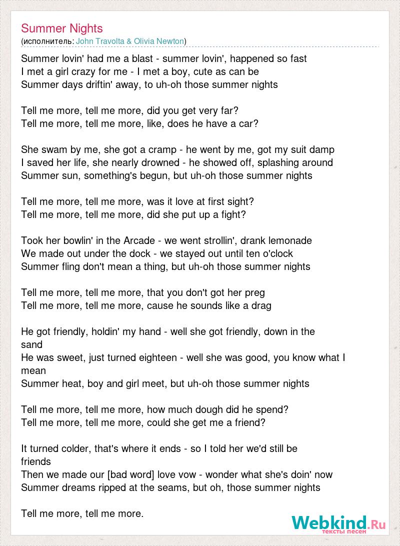 Summer lovin' had me a blast - summer lovin', happened so fast I met a girl crazy for me - I met a boy, cute as can be Summer days driftin' away, to uh-oh those summer nights Tell me more, tell me more, did you get very far? Tell me more, tell me more, like, does he have a car? She swam by me, she got a cramp - he went by me, got my suit damp I saved her life, she nearly drowned - he showed off, splashing around Summer sun, something's begun, but uh-oh those summer nights Tell me more, tell me more, was it love at first sight? Tell me more, tell me more, did she put up a fight? Took her bowlin' in the Arcade - we went strollin', drank lemonade We made out under the dock - we stayed out until ten o'clock Summer fling don't mean a thing, but uh-oh those summer nights Tell me more, tell me more, that you don't got her preg Tell me more, tell me more, cause he sounds like a drag He got friendly, holdin' my hand - well she got friendly, down in the sand He was sweet, just turned eighteen - well she was good, you know what I mean Summer heat, boy and girl meet, but uh-oh those summer nights Tell me more, tell me more, how much dough did he spend? Tell me more, tell me more, could she get me a friend? It turned colder, that's where it ends - so I told her we'd still be friends Then we made our [bad word] love vow - wonder what she's doin' now Summer dreams ripped at the seams, but oh, those summer nights Tell me more, tell me more.