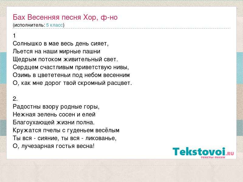 1 Солнышко в мае весь день сияет, Льется на наши мирные пашни Щедрым потоком живительный свет. Сердцем счастливым приветствую нивы, Озимь в цвететеньи под небом весенним О, как мне дорог твой скромный расцвет. 2. Радостны взору родные горы, Нежная зелень сосен и елей Благоухающей жизни полна. Кружатся пчелы с гуденьем весёлым Ты вся - сияние, ты вся - ликованье, О, лучезарная гостья весна!