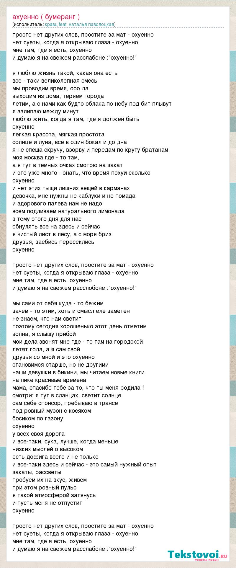 просто нет других слов, простите за мат - охуенно нет суеты, когда я открываю глаза - охуенно мне там, где я есть, охуенно и думаю я на свежем расслабоне :"охуенно!" я люблю жизнь такой, какая она есть все - таки великолепная смесь мы проводим время, ооо да выходим из дома, теряем города летим, а с нами как будто облака по небу под бит плывут я залипаю между минут люблю жить, когда я там, где я должен быть охуенно легкая красота, мягкая простота солнце и луна, все в один бокал и до дна я не спеша скручу, взорву и передам по кругу братанам моя москва где - то там, а я тут в темных очках смотрю на закат и это уже много - знать, что время похуй сколько охуенно и нет этих тыщи лишних вещей в карманах девочка, мне нужны не каблуки и не помада и здорового палева нам не надо всем подливаем натурального лимонада в тему этого дня для нас обнулять все на здесь и сейчас я чистый лист в лесу, а с моря бриз друзья, заебись пересеклись охуенно просто нет других слов, простите за мат - охуенно нет суеты, когда я открываю глаза - охуенно мне там, где я есть, охуенно и думаю я на свежем расслобоне :"охуенно!" мы сами от себя куда - то бежим зачем - то этим, хоть и смысл еле заметен не знаем, что нам светит поэтому сегодня хорошенько этот день отметим волна, я слышу прибой мои дела звонят мне где - то там на городской летят года, а я сам свой друзья со мной и это охуенно становимся старше, но не другими наши девушки в бикини, мы читаем новые книги на пике красивые времена мама, спасибо тебе за то, что ты меня родила ! смотри: я тут в сланцах, светит солнце сам себе спонсор, пребываю в трансе под ровный музон с косяком босиком по газону охуенно у всех своя дорога и все-таки, сука, лучше, когда меньше низких мыслей о высоком есть дофига всего и не только и все-таки здесь и сейчас - это самый нужный опыт закаты, рассветы пробуем их на вкус, живем при этом ровный пульс я такой атмосферой затянусь и пусть меня не отпустит охуенно просто нет других слов, простите за мат - охуенно нет суеты, когда я открываю глаза - охуенно мне там, где я есть, охуенно и думаю я на свежем расслабоне :"охуенно!"