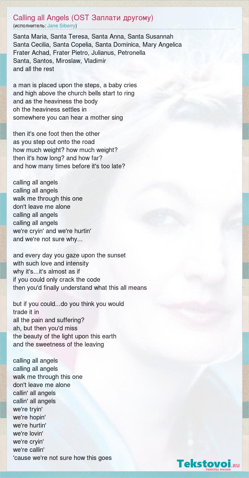 Santa Maria, Santa Teresa, Santa Anna, Santa Susannah Santa Cecilia, Santa Copelia, Santa Dominica, Mary Angelica Frater Achad, Frater Pietro, Julianus, Petronella Santa, Santos, Miroslaw, Vladimir and all the rest a man is placed upon the steps, a baby cries and high above the church bells start to ring and as the heaviness the body oh the heaviness settles in somewhere you can hear a mother sing then it's one foot then the other as you step out onto the road how much weight? how much weight? then it's how long? and how far? and how many times before it's too late? calling all angels calling all angels walk me through this one don't leave me alone calling all angels calling all angels we're cryin' and we're hurtin' and we're not sure why... and every day you gaze upon the sunset with such love and intensity why it's...it's almost as if if you could only crack the code then you'd finally understand what this all means but if you could...do you think you would trade it in all the pain and suffering? ah, but then you'd miss the beauty of the light upon this earth and the sweetness of the leaving calling all angels calling all angels walk me through this one don't leave me alone callin' all angels callin' all angels we're tryin' we're hopin' we're hurtin' we're lovin' we're cryin' we're callin' 'cause we're not sure how this goes