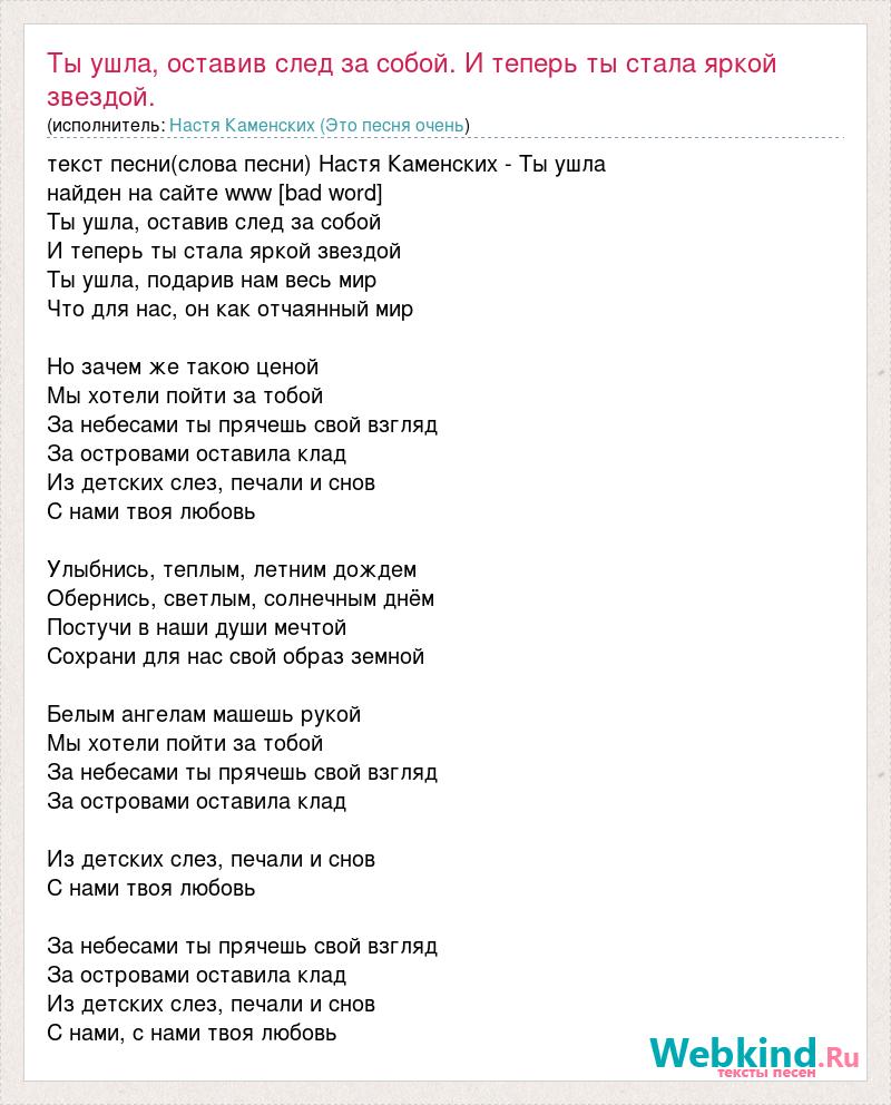 Главная→Исполнители→Настя Каменских (Это песня очень очень красивая, я ревела полчаса...)→Ты ушла, оставив след за собой. И теперь ты стала яркой звездой. Ты ушл