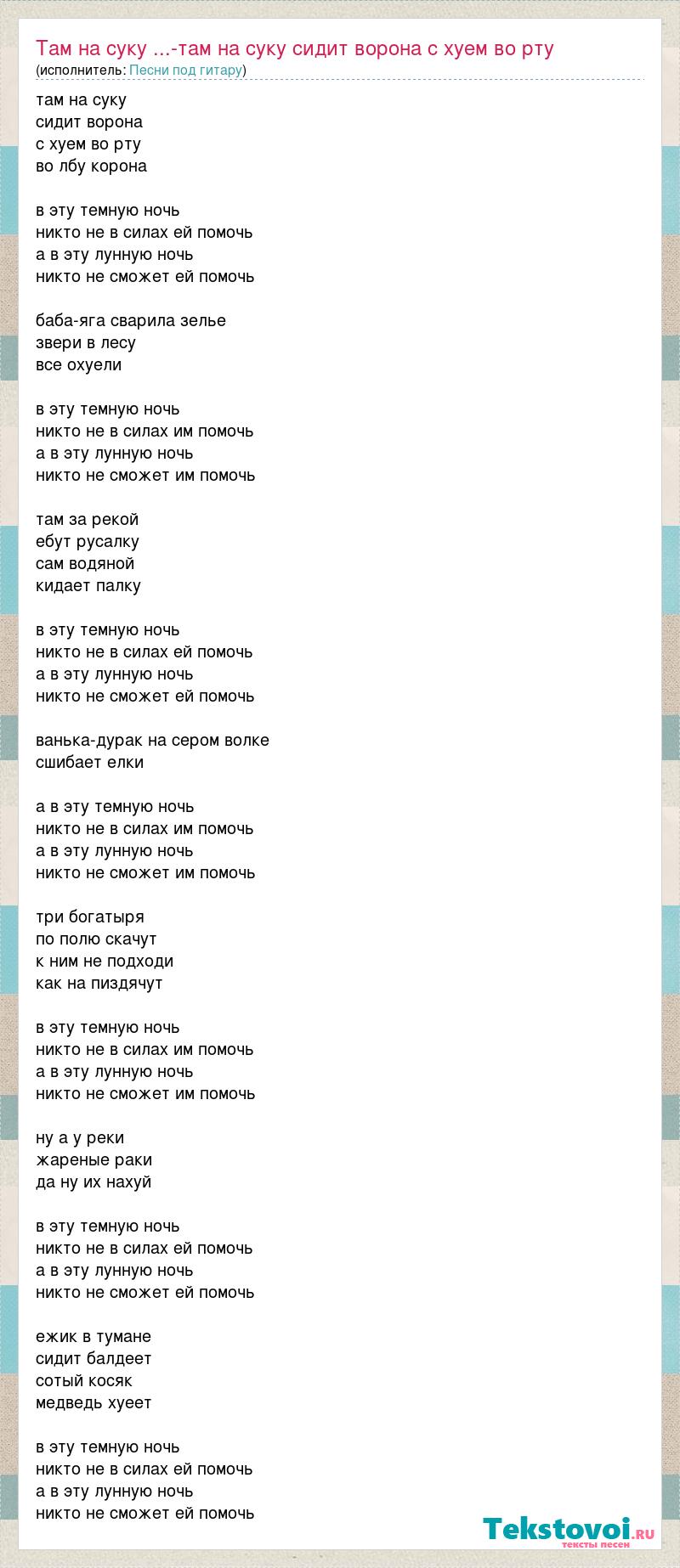 А как ты думаешь, о чем песня "Там на суку ...-там на суку сидит ворона с хуем во рту" ?