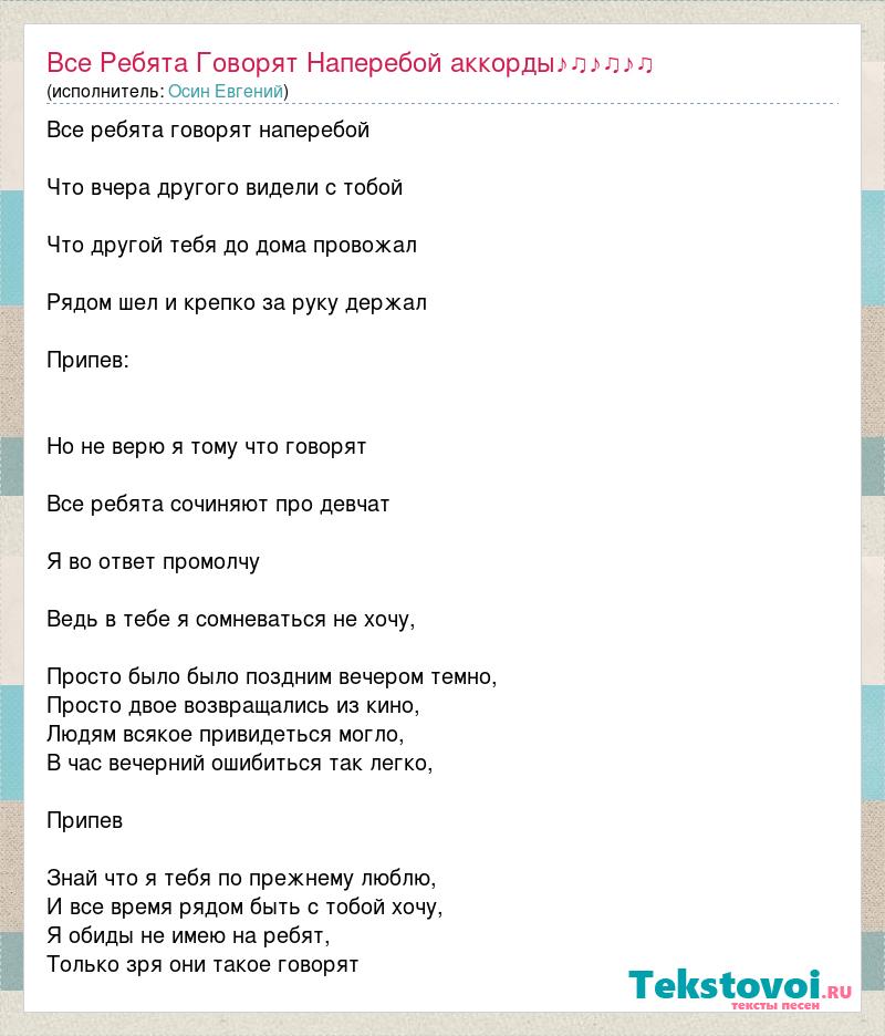 Все ребята говорят наперебой Что вчера другого видели с тобой Что другой тебя до дома провожал Рядом шел и крепко за руку держал Припев: Hо не верю я тому что говорят Все ребята сочиняют про девчат Я во ответ промолчу Ведь в тебе я сомневаться не хочу, Просто было было поздним вечером темно, Просто двое возвращались из кино, Людям всякое привидеться могло, В час вечерний ошибиться так легко, Припев Знай что я тебя по прежнему люблю, И все время рядом быть с тобой хочу, Я обиды не имею на ребят, Только зря они такое говорят