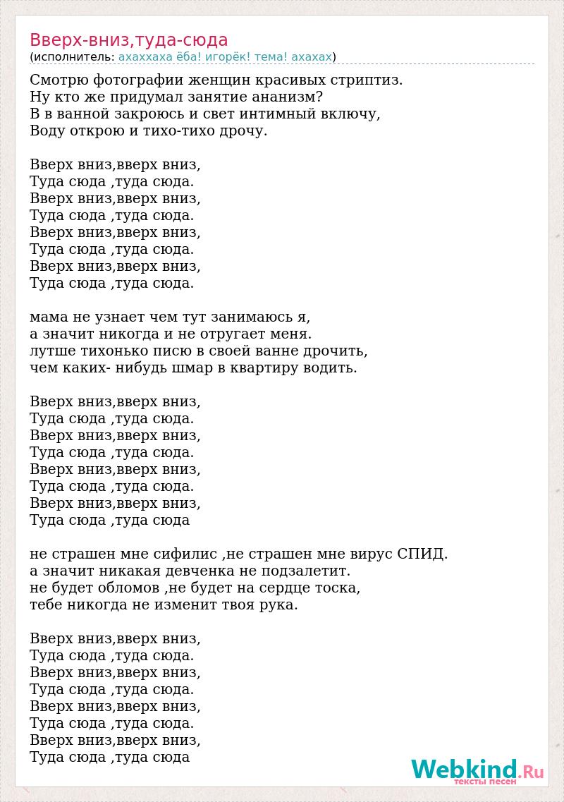 Смотрю фотографии женщин красивых стриптиз. Ну кто же придумал занятие ананизм? В в ванной закроюсь и свет интимный включу, Воду открою и тихо-тихо дрочу. Вверх вниз,вверх вниз, Туда сюда ,туда сюда. Вверх вниз,вверх вниз, Туда сюда ,туда сюда. Вверх вниз,вверх вниз, Туда сюда ,туда сюда. Вверх вниз,вверх вниз, Туда сюда ,туда сюда. мама не узнает чем тут занимаюсь я, а значит никогда и не отругает меня. лутше тихонько писю в своей ванне дрочить, чем каких- нибудь шмар в квартиру водить. Вверх вниз,вверх вниз, Туда сюда ,туда сюда. Вверх вниз,вверх вниз, Туда сюда ,туда сюда. Вверх вниз,вверх вниз, Туда сюда ,туда сюда. Вверх вниз,вверх вниз, Туда сюда ,туда сюда не страшен мне сифилис ,не страшен мне вирус СПИД. а значит никакая девченка не подзалетит. не будет обломов ,не будет на сердце тоска, тебе никогда не изменит твоя рука. Вверх вниз,вверх вниз, Туда сюда ,туда сюда. Вверх вниз,вверх вниз, Туда сюда ,туда сюда. Вверх вниз,вверх вниз, Туда сюда ,туда сюда. Вверх вниз,вверх вниз, Туда сюда ,туда сюда