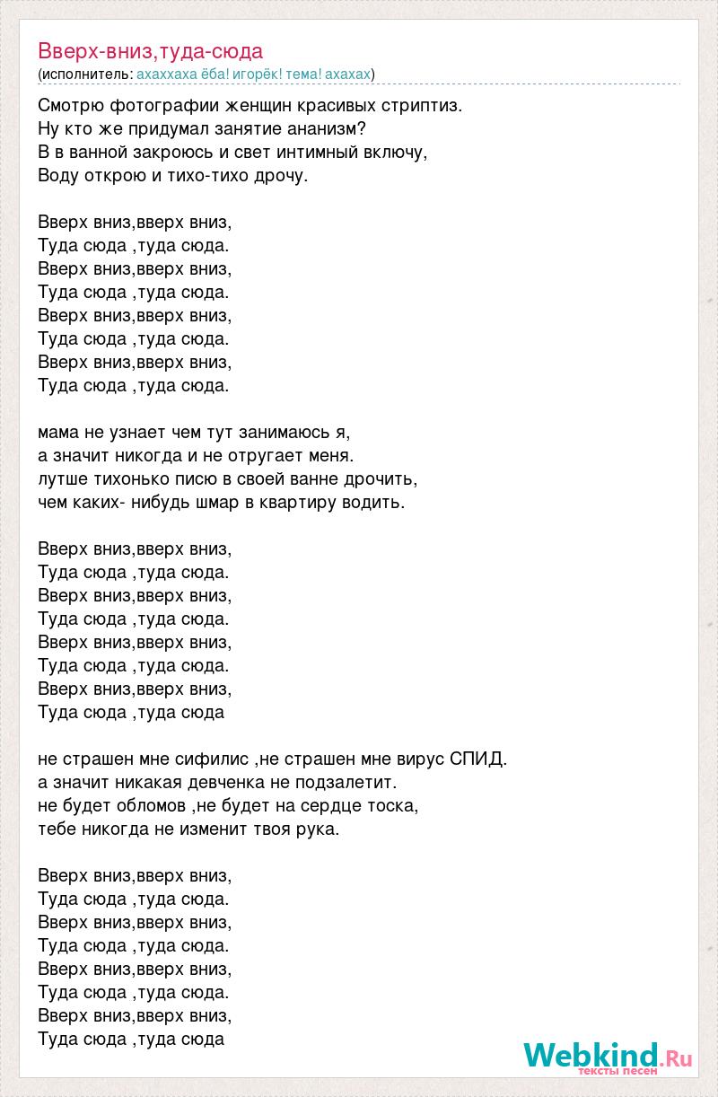 Смотрю фотографии женщин красивых стриптиз. Ну кто же придумал занятие ананизм? В в ванной закроюсь и свет интимный включу, Воду открою и тихо-тихо дрочу. Вверх вниз,вверх вниз, Туда сюда ,туда сюда. Вверх вниз,вверх вниз, Туда сюда ,туда сюда. Вверх вниз,вверх вниз, Туда сюда ,туда сюда. Вверх вниз,вверх вниз, Туда сюда ,туда сюда. мама не узнает чем тут занимаюсь я, а значит никогда и не отругает меня. лутше тихонько писю в своей ванне дрочить, чем каких- нибудь шмар в квартиру водить. Вверх вниз,вверх вниз, Туда сюда ,туда сюда. Вверх вниз,вверх вниз, Туда сюда ,туда сюда. Вверх вниз,вверх вниз, Туда сюда ,туда сюда. Вверх вниз,вверх вниз, Туда сюда ,туда сюда не страшен мне сифилис ,не страшен мне вирус СПИД. а значит никакая девченка не подзалетит. не будет обломов ,не будет на сердце тоска, тебе никогда не изменит твоя рука. Вверх вниз,вверх вниз, Туда сюда ,туда сюда. Вверх вниз,вверх вниз, Туда сюда ,туда сюда. Вверх вниз,вверх вниз, Туда сюда ,туда сюда. Вверх вниз,вверх вниз, Туда сюда ,туда сюда