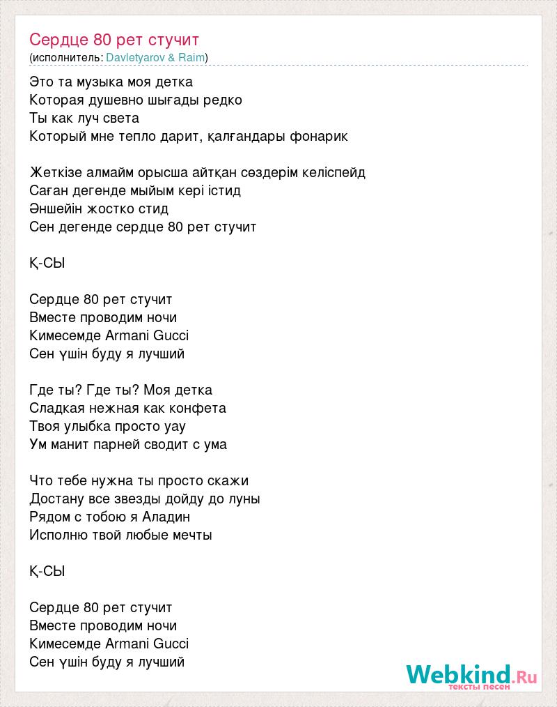 Это та музыка моя детка Которая душевно шығады редко Ты как луч света Который мне тепло дарит, қалғандары фонарик Жеткізе алмайм орысша айтқан сөздерім келіспейд Саған дегенде мыйым кері істид Әншейін жостко стид Сен дегенде сердце 80 рет стучит Қ-СЫ Сердце 80 рет стучит Вместе проводим ночи Кимесемде Armani Gucci Сен үшін буду я лучший Где ты? Где ты? Моя детка Сладкая нежная как конфета Твоя улыбка просто уау Ум манит парней сводит с ума Что тебе нужна ты просто скажи Достану все звезды дойду до луны Рядом с тобою я Аладин Исполню твой любые мечты Қ-СЫ Сердце 80 рет стучит Вместе проводим ночи Кимесемде Armani Gucci Сен үшін буду я лучший