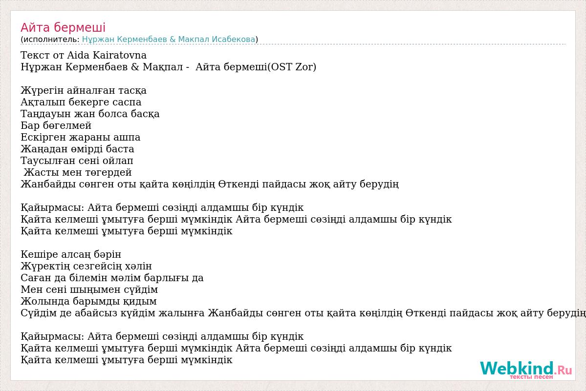 Текст от Aida Kairatovna Нұржан Керменбаев & Мақпал - Айта бермеші💕(OST Zor) Жүрегін айналған тасқа Ақталып бекерге саспа Таңдауын жан болса басқа Бар бөгелмей Ескірген жараны ашпа Жаңадан өмірді баста Таусылған сені ойлап Жасты мен төгердей Жанбайды сөнген оты қайта көңілдің Өткенді пайдасы жоқ айту берудің Қайырмасы: Айта бермеші сөзіңді алдамшы бір күндік Қайта келмеші ұмытуға берші мүмкіндік Айта бермеші сөзіңді алдамшы бір күндік Қайта келмеші ұмытуға берші мүмкіндік Кешіре алсаң бәрін Жүректің сезгейсің хәлін Саған да білемін мәлім барлығы да Мен сені шыңымен сүйдім Жолында барымды қидым Сүйдім де абайсыз күйдім жалынға Жанбайды сөнген оты қайта көңілдің Өткенді пайдасы жоқ айту берудің Қайырмасы: Айта бермеші сөзіңді алдамшы бір күндік Қайта келмеші ұмытуға берші мүмкіндік Айта бермеші сөзіңді алдамшы бір күндік Қайта келмеші ұмытуға берші мүмкіндік
