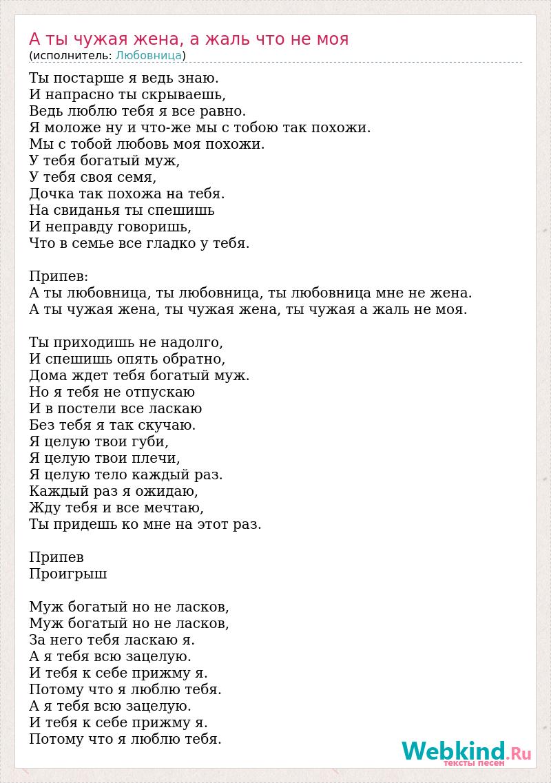Ты постарше я ведь знаю. И напрасно ты скрываешь, Ведь люблю тебя я все равно. Я моложе ну и что-же мы с тобою так похожи. Мы с тобой любовь моя похожи. У тебя богатый муж, У тебя своя семя, Дочка так похожа на тебя. На свиданья ты спешишь И неправду говоришь, Что в семье все гладко у тебя. Припев: А ты любовница, ты любовница, ты любовница мне не жена. А ты чужая жена, ты чужая жена, ты чужая а жаль не моя. Ты приходишь не надолго, И спешишь опять обратно, Дома ждет тебя богатый муж. Но я тебя не отпускаю И в постели все ласкаю Без тебя я так скучаю. Я целую твои губи, Я целую твои плечи, Я целую тело каждый раз. Каждый раз я ожидаю, Жду тебя и все мечтаю, Ты придешь ко мне на этот раз. Припев Проигрыш Муж богатый но не ласков, Муж богатый но не ласков, За него тебя ласкаю я. А я тебя всю зацелую. И тебя к себе прижму я. Потому что я люблю тебя. А я тебя всю зацелую. И тебя к себе прижму я. Потому что я люблю тебя.