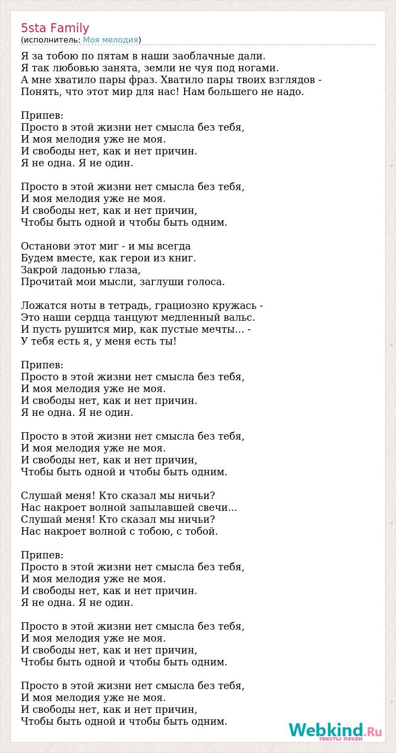 Я за тобою по пятам в наши заоблачные дали. Я так любовью занята, земли не чуя под ногами. А мне хватило пары фраз. Хватило пары твоих взглядов - Понять, что этот мир для нас! Нам большего не надо. Припев: Просто в этой жизни нет смысла без тебя, И моя мелодия уже не моя. И свободы нет, как и нет причин. Я не одна. Я не один. Просто в этой жизни нет смысла без тебя, И моя мелодия уже не моя. И свободы нет, как и нет причин, Чтобы быть одной и чтобы быть одним. Останови этот миг - и мы всегда Будем вместе, как герои из книг. Закрой ладонью глаза, Прочитай мои мысли, заглуши голоса. Ложатся ноты в тетрадь, грациозно кружась - Это наши сердца танцуют медленный вальс. И пусть рушится мир, как пустые мечты... - У тебя есть я, у меня есть ты! Припев: Просто в этой жизни нет смысла без тебя, И моя мелодия уже не моя. И свободы нет, как и нет причин. Я не одна. Я не один. Просто в этой жизни нет смысла без тебя, И моя мелодия уже не моя. И свободы нет, как и нет причин, Чтобы быть одной и чтобы быть одним. Слушай меня! Кто сказал мы ничьи? Нас накроет волной запылавшей свечи... Слушай меня! Кто сказал мы ничьи? Нас накроет волной с тобою, с тобой. Припев: Просто в этой жизни нет смысла без тебя, И моя мелодия уже не моя. И свободы нет, как и нет причин. Я не одна. Я не один. Просто в этой жизни нет смысла без тебя, И моя мелодия уже не моя. И свободы нет, как и нет причин, Чтобы быть одной и чтобы быть одним. Просто в этой жизни нет смысла без тебя, И моя мелодия уже не моя. И свободы нет, как и нет причин, Чтобы быть одной и чтобы быть одним.