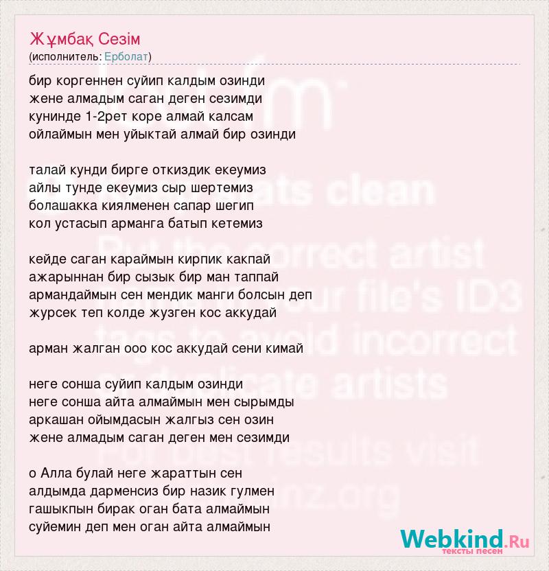 бир коргеннен суйип калдым озинди жене алмадым саган деген сезимди кунинде 1-2рет коре алмай калсам ойлаймын мен уйыктай алмай бир озинди талай кунди бирге откиздик екеумиз айлы тунде екеумиз сыр шертемиз болашакка киялменен сапар шегип кол устасып арманга батып кетемиз кейде саган караймын кирпик какпай ажарыннан бир сызык бир ман таппай армандаймын сен мендик манги болсын деп журсек теп колде жузген кос аккудай арман жалган ооо кос аккудай сени кимай неге сонша суйип калдым озинди неге сонша айта алмаймын мен сырымды аркашан ойымдасын жалгыз сен озин жене алмадым саган деген мен сезимди о Алла булай неге жараттын сен алдымда дарменсиз бир назик гулмен гашыкпын бирак оган бата алмаймын суйемин деп мен оган айта алмаймын