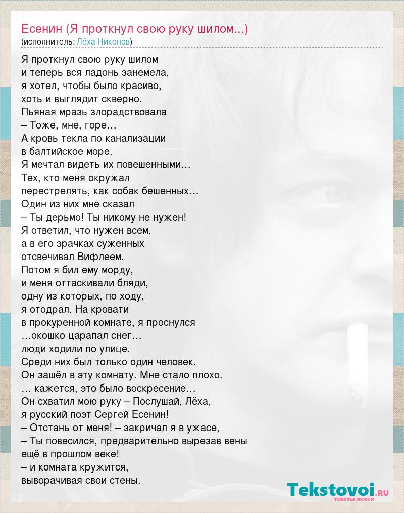 А как ты думаешь, о чем песня "Есенин (Я проткнул свою руку шилом...)" ?