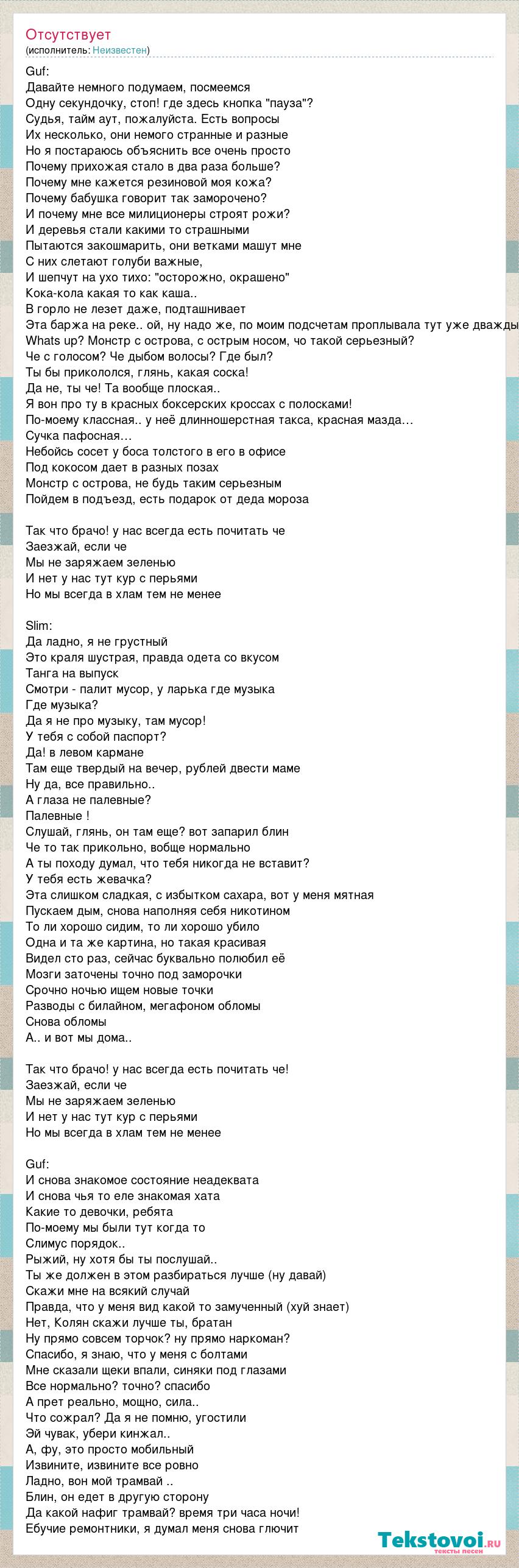 Guf: Давайте немного подумаем, посмеемся Одну секундочку, стоп! где здесь кнопка "пауза"? Судья, тайм аут, пожалуйста. Есть вопросы Их несколько, они немого странные и разные Но я постараюсь объяснить все очень просто Почему прихожая стало в два раза больше? Почему мне кажется резиновой моя кожа? Почему бабушка говорит так заморочено? И почему мне все милиционеры строят рожи? И деревья стали какими то страшными Пытаются закошмарить, они ветками машут мне С них слетают голуби важные, И шепчут на ухо тихо: "осторожно, окрашено" Кока-кола какая то как каша.. В горло не лезет даже, подташнивает Эта баржа на реке.. ой, ну надо же, по моим подсчетам проплывала тут уже дважды Whats up? Монстр с острова, с острым носом, чо такой серьезный? Че с голосом? Че дыбом волосы? Где был? Ты бы прикололся, глянь, какая соска! Да не, ты че! Та вообще плоская.. Я вон про ту в красных боксерских кроссах с полосками! По-моему классная.. у неё длинношерстная такса, красная мазда… Сучка пафосная… Небойсь сосет у боса толстого в его в офисе Под кокосом дает в разных позах Монстр с острова, не будь таким серьезным Пойдем в подъезд, есть подарок от деда мороза Так что брачо! у нас всегда есть почитать че Заезжай, если че Мы не заряжаем зеленью И нет у нас тут кур с перьями Но мы всегда в хлам тем не менее Slim: Да ладно, я не грустный Это краля шустрая, правда одета со вкусом Танга на выпуск Смотри - палит мусор, у ларька где музыка Где музыка? Да я не про музыку, там мусор! У тебя с собой паспорт? Да! в левом кармане Там еще твердый на вечер, рублей двести маме Ну да, все правильно.. А глаза не палевные? Палевные ! Слушай, глянь, он там еще? вот запарил блин Че то так прикольно, вобще нормально А ты походу думал, что тебя никогда не вставит? У тебя есть жевачка? Эта слишком сладкая, с избытком сахара, вот у меня мятная Пускаем дым, снова наполняя себя никотином То ли хорошо сидим, то ли хорошо убило Одна и та же картина, но такая красивая Видел сто раз, сейчас буквально полюбил её Мозги заточены точно под заморочки Срочно ночью ищем новые точки Разводы с билайном, мегафоном обломы Снова обломы А.. и вот мы дома.. Так что брачо! у нас всегда есть почитать че! Заезжай, если че Мы не заряжаем зеленью И нет у нас тут кур с перьями Но мы всегда в хлам тем не менее Guf: И снова знакомое состояние неадеквата И снова чья то еле знакомая хата Какие то девочки, ребята По-моему мы были тут когда то Слимус порядок.. Рыжий, ну хотя бы ты послушай.. Ты же должен в этом разбираться лучше (ну давай) Скажи мне на всякий случай Правда, что у меня вид какой то замученный (хуй знает) Нет, Колян скажи лучше ты, братан Ну прямо совсем торчок? ну прямо наркоман? Спасибо, я знаю, что у меня с болтами Мне сказали щеки впали, синяки под глазами Все нормально? точно? спасибо А прет реально, мощно, сила.. Что сожрал? Да я не помню, угостили Эй чувак, убери кинжал.. А, фу, это просто мобильный Извините, извините все ровно Ладно, вон мой трамвай .. Блин, он едет в другую сторону Да какой нафиг трамвай? время три часа ночи! Ебучие ремонтники, я думал меня снова глючит