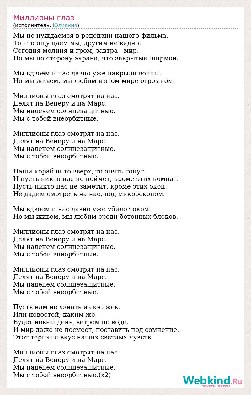 Мы не нуждаемся в рецензии нашего фильма. То что ощущаем мы, другим не видно. Сегодня молния и гром, завтра - мир. Но мы по сторону экрана, что закрытый ширмой. Мы вдвоем и нас давно уже накрыли волны. Но мы живем, мы любим в этом мире огромном. Миллионы глаз смотрят на нас. Делят на Венеру и на Марс. Мы наденем солнцезащитные. Мы с тобой внеорбитные. Миллионы глаз смотрят на нас. Делят на Венеру и на Марс. Мы наденем солнцезащитные. Мы с тобой внеорбитные. Наши корабли то вверх, то опять тонут. И пусть никто нас не поймет, кроме этих комнат. Пусть никто нас не заметит, кроме этих окон. Не дадим смотреть на нас, под микроскопом. Мы вдвоем и нас давно уже убило током. Но мы живем, мы любим среди бетонных блоков. Миллионы глаз смотрят на нас. Делят на Венеру и на Марс. Мы наденем солнцезащитные. Мы с тобой внеорбитные. Миллионы глаз смотрят на нас. Делят на Венеру и на Марс. Мы наденем солнцезащитные. Мы с тобой внеорбитные. Пусть нам не узнать из книжек. Или новостей, каким же. Будет новый день, ветром по воде. И мир даже не посмеет, поставить под сомнение. Этот терпкий вкус наших светлых чувств. Миллионы глаз смотрят на нас. Делят на Венеру и на Марс. Мы наденем солнцезащитные. Мы с тобой внеорбитные.(х2)
