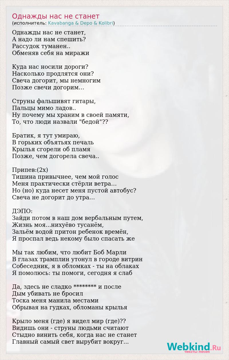 Однажды нас не станет, А надо ли нам спешить? Рассудок туманен.. Обменяв себя на миражи Куда нас носили дороги? Насколько продлятся они? Свеча догорит, мы немногим Позже свечи догорим… Струны фальшивят гитары, Пальцы мимо ладов.. Ну почему мы храним в своей памяти, То, что люди назвали "бедой"?? Братик, я тут умираю, В горьких объятьях печаль Крылья сгорели об пламя Позже, чем догорела свеча.. Припев:(2х) Тишина привычнее, чем мой голос Меня практически стёрли ветра… Но (но) куда несет меня пустой автобус? Свеча не догорит до утра… ДЭПО: Зайди потом в наш дом вербальным путем, Жизнь моя...нихуёво тусанём, Зальём водой притон ребенок времён, Я проспал ведь некому было спасать же Мы так любим, что любит Боб Марли В глазах трамплин утонул в городе витрин Собеседник, я в обломках - ты на облаках Я помолюсь: ты помоги, сегодня я слаб Да, здесь не сладко ******** и после Дым убивать не бросил Тоска меня манила местами Обрывая на гудках, обломаны крылья Крыло меня (где) я видел мир (где)?? Видишь они - струны людьми считают Стыдно винить себя, когда нас не станет Главный самый свет вырубит вокруг...