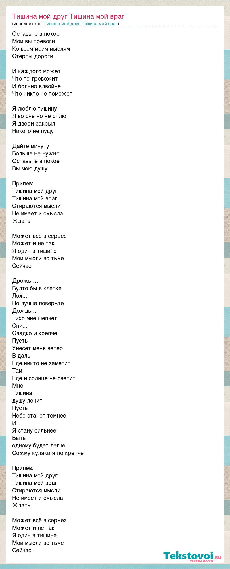 Оставьте в покое Мои вы тревоги Ко всем моим мыслям Стерты дороги И каждого может Что то тревожит И больно вдвойне Что никто не поможет Я люблю тишину Я во сне но не сплю Я двери закрыл Никого не пущу Дайте минуту Больше не нужно Оставьте в покое Вы мою душу Припев: Тишина мой друг Тишина мой враг Стираются мысли Не имеет и смысла Ждать Может всё в серьез Может и не так Я один в тишине Мои мысли во тьме Сейчас Дрожь ... Будто бы в клетке Лож... Но лучше поверьте Дождь... Тихо мне шепчет Спи... Сладко и крепче Пусть Унесёт меня ветер В даль Где никто не заметит Там Где и солнце не светит Мне Тишина душу лечит Пусть Небо станет темнее И Я стану сильнее Быть одному будет легче Сожму кулаки я по крепче Припев: Тишина мой друг Тишина мой враг Стираются мысли Не имеет и смысла Ждать Может всё в серьез Может и не так Я один в тишине Мои мысли во тьме Сейчас