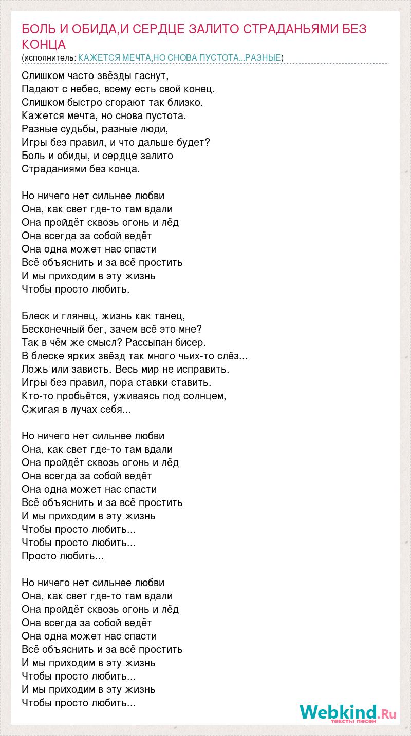 Слишком часто звёзды гаснут, Падают с небес, всему есть свой конец. Слишком быстро сгорают так близко. Кажется мечта, но снова пустота. Разные судьбы, разные люди, Игры без правил, и что дальше будет? Боль и обиды, и сердце залито Страданиями без конца. Но ничего нет сильнее любви Она, как свет где-то там вдали Она пройдёт сквозь огонь и лёд Она всегда за собой ведёт Она одна может нас спасти Всё объяснить и за всё простить И мы приходим в эту жизнь Чтобы просто любить. Блеск и глянец, жизнь как танец, Бесконечный бег, зачем всё это мне? Так в чём же смысл? Рассыпан бисер. В блеске ярких звёзд так много чьих-то слёз... Ложь или зависть. Весь мир не исправить. Игры без правил, пора ставки ставить. Кто-то пробьётся, уживаясь под солнцем, Сжигая в лучах себя... Но ничего нет сильнее любви Она, как свет где-то там вдали Она пройдёт сквозь огонь и лёд Она всегда за собой ведёт Она одна может нас спасти Всё объяснить и за всё простить И мы приходим в эту жизнь Чтобы просто любить... Чтобы просто любить... Просто любить... Но ничего нет сильнее любви Она, как свет где-то там вдали Она пройдёт сквозь огонь и лёд Она всегда за собой ведёт Она одна может нас спасти Всё объяснить и за всё простить И мы приходим в эту жизнь Чтобы просто любить... И мы приходим в эту жизнь Чтобы просто любить...