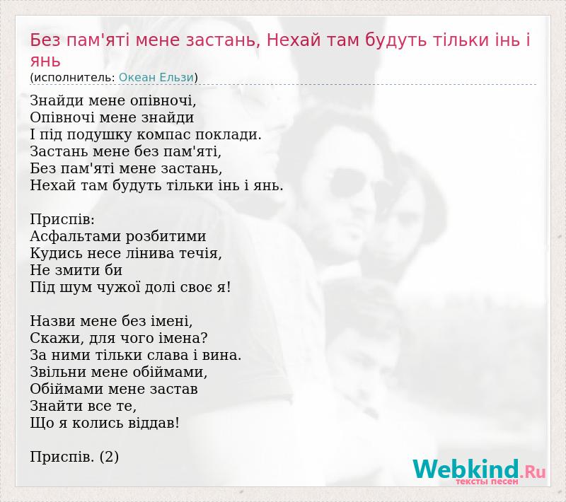 Знайди мене опівночі, Опівночі мене знайди І під подушку компас поклади. Застань мене без пам'яті, Без пам'яті мене застань, Нехай там будуть тільки інь і янь. Приспів: Асфальтами розбитими Кудись несе лінива течія, Не змити би Під шум чужої долі своє я! Назви мене без імені, Скажи, для чого імена? За ними тільки слава і вина. Звільни мене обіймами, Обіймами мене застав Знайти все те, Що я колись віддав! Приспів. (2)