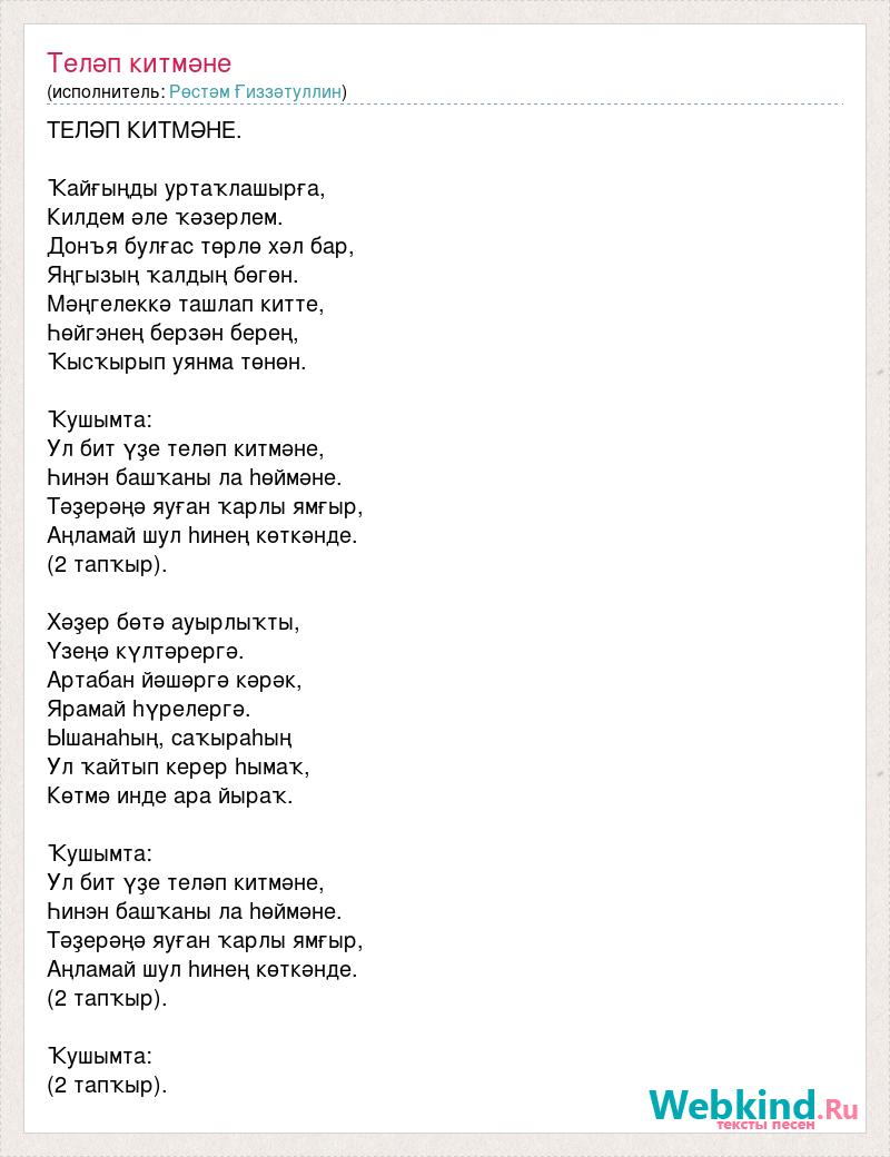 ТЕЛӘП КИТМӘНЕ. Ҡайғыңды уртаҡлашырға, Килдем әле ҡәзерлем. Донъя булғас төрлө хәл бар, Яңгызың ҡалдың бөгөн. Мәңгелеккә ташлап китте, Һөйгэнең берзән берең, Ҡысҡырып уянма төнөн. Ҡушымта: Ул бит үҙе теләп китмәне, Һинэн башҡаны ла hөймәне. Тәҙерәңә яуған ҡарлы ямғыр, Аңламай шул hинең көткәнде. (2 тапҡыр). Хәҙер бөтә ауырлыҡты, Үзеңә күлтәрергә. Артабан йәшәргә кәрәк, Ярамай hүрелергә. Ышанаhың, саҡыраhың Ул ҡайтып керер hымаҡ, Көтмә инде ара йыраҡ. Ҡушымта: Ул бит үҙе теләп китмәне, Һинэн башҡаны ла hөймәне. Тәҙерәңә яуған ҡарлы ямғыр, Аңламай шул hинең көткәнде. (2 тапҡыр). Ҡушымта: (2 тапҡыр).