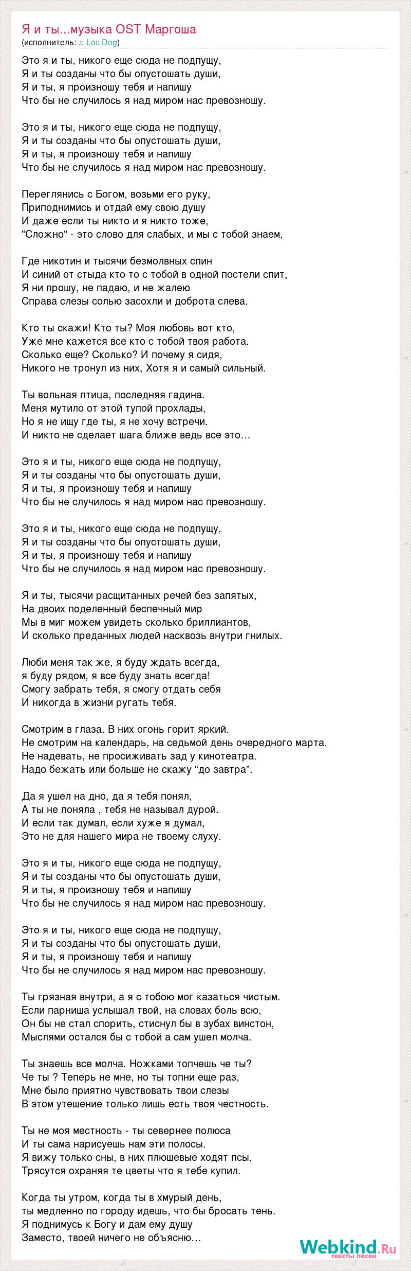 Это я и ты, никого еще сюда не подпущу, Я и ты созданы что бы опустошать души, Я и ты, я произношу тебя и напишу Что бы не случилось я над миром нас превозношу. Это я и ты, никого еще сюда не подпущу, Я и ты созданы что бы опустошать души, Я и ты, я произношу тебя и напишу Что бы не случилось я над миром нас превозношу. Переглянись с Богом, возьми его руку, Приподнимись и отдай ему свою душу И даже если ты никто и я никто тоже, "Сложно" - это слово для слабых, и мы с тобой знаем, Где никотин и тысячи безмолвных спин И синий от стыда кто то с тобой в одной постели спит, Я ни прошу, не падаю, и не жалею Справа слезы солью засохли и доброта слева. Кто ты скажи! Кто ты? Моя любовь вот кто, Уже мне кажется все кто с тобой твоя работа. Сколько еще? Сколько? И почему я сидя, Никого не тронул из них, Хотя я и самый сильный. Ты вольная птица, последняя гадина. Меня мутило от этой тупой прохлады, Но я не ищу где ты, я не хочу встречи. И никто не сделает шага ближе ведь все это… Это я и ты, никого еще сюда не подпущу, Я и ты созданы что бы опустошать души, Я и ты, я произношу тебя и напишу Что бы не случилось я над миром нас превозношу. Это я и ты, никого еще сюда не подпущу, Я и ты созданы что бы опустошать души, Я и ты, я произношу тебя и напишу Что бы не случилось я над миром нас превозношу. Я и ты, тысячи расщитанных речей без запятых, На двоих поделенный беспечный мир Мы в миг можем увидеть сколько бриллиантов, И сколько преданных людей насквозь внутри гнилых. Люби меня так же, я буду ждать всегда, я буду рядом, я все буду знать всегда! Смогу забрать тебя, я смогу отдать себя И никогда в жизни ругать тебя. Смотрим в глаза. В них огонь горит яркий. Не смотрим на календарь, на седьмой день очередного марта. Не надевать, не просиживать зад у кинотеатра. Надо бежать или больше не скажу “до завтра”. Да я ушел на дно, да я тебя понял, А ты не поняла , тебя не называл дурой. И если так думал, если хуже я думал, Это не для нашего мира не твоему слуху. Это я и ты, никого еще сюда не подпущу, Я и ты созданы что бы опустошать души, Я и ты, я произношу тебя и напишу Что бы не случилось я над миром нас превозношу. Это я и ты, никого еще сюда не подпущу, Я и ты созданы что бы опустошать души, Я и ты, я произношу тебя и напишу Что бы не случилось я над миром нас превозношу. Ты грязная внутри, а я с тобою мог казаться чистым. Если парниша услышал твой, на словах боль всю, Он бы не стал спорить, стиснул бы в зубах винстон, Мыслями остался бы с тобой а сам ушел молча. Ты знаешь все молча. Ножками топчешь че ты? Че ты ? Теперь не мне, но ты топни еще раз, Мне было приятно чувствовать твои слезы В этом утешение только лишь есть твоя честность. Ты не моя местность - ты севернее полюса И ты сама нарисуешь нам эти полосы. Я вижу только сны, в них плюшевые ходят псы, Трясутся охраняя те цветы что я тебе купил. Когда ты утром, когда ты в хмурый день, ты медленно по городу идешь, что бы бросать тень. Я поднимусь к Богу и дам ему душу Заместо, твоей ничего не объясню…
