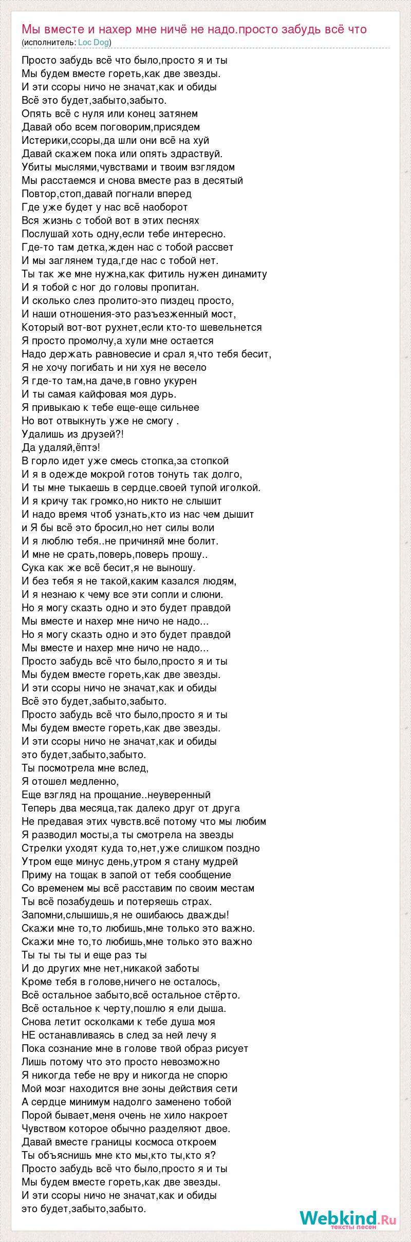 Просто забудь всё что было,просто я и ты Мы будем вместе гореть,как две звезды. И эти ссоры ничо не значат,как и обиды Всё это будет,забыто,забыто. Опять всё с нуля или конец затянем Давай обо всем поговорим,присядем Истерики,ссоры,да шли они всё на хуй Давай скажем пока или опять здраствуй. Убиты мыслями,чувствами и твоим взглядом Мы расстаемся и снова вместе раз в десятый Повтор,стоп,давай погнали вперед Где уже будет у нас всё наоборот Вся жизнь с тобой вот в этих песнях Послушай хоть одну,если тебе интересно. Где-то там детка,жден нас с тобой рассвет И мы заглянем туда,где нас с тобой нет. Ты так же мне нужна,как фитиль нужен динамиту И я тобой с ног до головы пропитан. И сколько слез пролито-это пиздец просто, И наши отношения-это разъезженный мост, Который вот-вот рухнет,если кто-то шевельнется Я просто промолчу,а хули мне остается Надо держать равновесие и срал я,что тебя бесит, Я не хочу погибать и ни хуя не весело Я где-то там,на даче,в говно укурен И ты самая кайфовая моя дурь. Я привыкаю к тебе еще-еще сильнее Но вот отвыкнуть уже не смогу . Удалишь из друзей?! Да удаляй,ёптэ! В горло идет уже смесь стопка,за стопкой И я в одежде мокрой готов тонуть так долго, И ты мне тыкаешь в сердце.своей тупой иголкой. И я кричу так громко,но никто не слышит И надо время чтоб узнать,кто из нас чем дышит и Я бы всё это бросил,но нет силы воли И я люблю тебя..не причиняй мне болит. И мне не срать,поверь,поверь прошу.. Сука как же всё бесит,я не выношу. И без тебя я не такой,каким казался людям, И я незнаю к чему все эти сопли и слюни. Но я могу сказть одно и это будет правдой Мы вместе и нахер мне ничо не надо... Но я могу сказть одно и это будет правдой Мы вместе и нахер мне ничо не надо... Просто забудь всё что было,просто я и ты Мы будем вместе гореть,как две звезды. И эти ссоры ничо не значат,как и обиды Всё это будет,забыто,забыто. Просто забудь всё что было,просто я и ты Мы будем вместе гореть,как две звезды. И эти ссоры ничо не значат,как и обиды это будет,забыто,забыто. Ты посмотрела мне вслед, Я отошел медленно, Еще взгляд на прощание..неуверенный Теперь два месяца,так далеко друг от друга Не предавая этих чувств.всё потому что мы любим Я разводил мосты,а ты смотрела на звезды Стрелки уходят куда то,нет,уже слишком поздно Утром еще минус день,утром я стану мудрей Приму на тощак в запой от тебя сообщение Со временем мы всё расставим по своим местам Ты всё позабудешь и потеряешь страх. Запомни,слышишь,я не ошибаюсь дважды! Скажи мне то,то любишь,мне только это важно. Скажи мне то,то любишь,мне только это важно Ты ты ты ты и еще раз ты И до других мне нет,никакой заботы Кроме тебя в голове,ничего не осталось, Всё остальное забыто,всё остальное стёрто. Всё остальное к черту,пошлю я ели дыша. Снова летит осколками к тебе душа моя НЕ останавливаясь в след за ней лечу я Пока сознание мне в голове твой образ рисует Лишь потому что это просто невозможно Я никогда тебе не вру и никогда не спорю Мой мозг находится вне зоны действия сети А сердце минимум надолго заменено тобой Порой бывает,меня очень не хило накроет Чувством которое обычно разделяют двое. Давай вместе границы космоса откроем Ты объяснишь мне кто мы,кто ты,кто я? Просто забудь всё что было,просто я и ты Мы будем вместе гореть,как две звезды. И эти ссоры ничо не значат,как и обиды это будет,забыто,забыто.