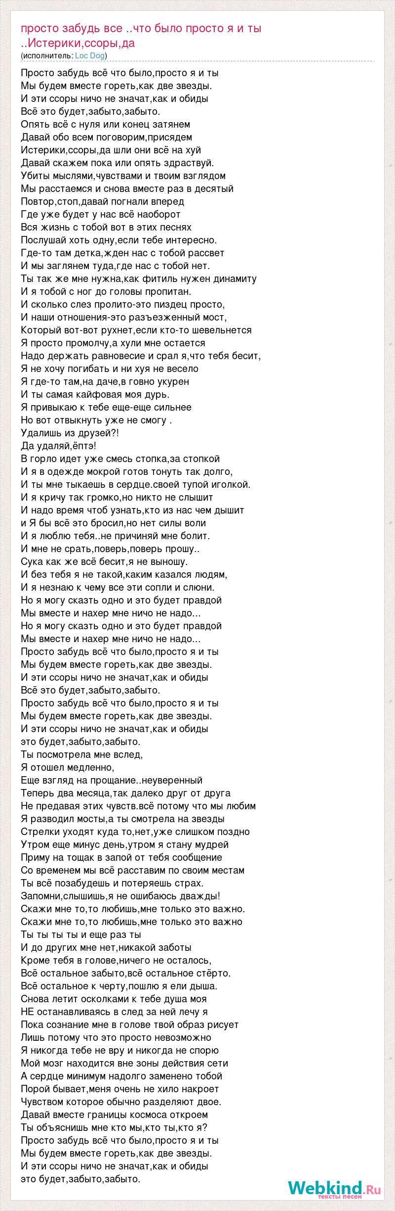 Просто забудь всё что было,просто я и ты Мы будем вместе гореть,как две звезды. И эти ссоры ничо не значат,как и обиды Всё это будет,забыто,забыто. Опять всё с нуля или конец затянем Давай обо всем поговорим,присядем Истерики,ссоры,да шли они всё на хуй Давай скажем пока или опять здраствуй. Убиты мыслями,чувствами и твоим взглядом Мы расстаемся и снова вместе раз в десятый Повтор,стоп,давай погнали вперед Где уже будет у нас всё наоборот Вся жизнь с тобой вот в этих песнях Послушай хоть одну,если тебе интересно. Где-то там детка,жден нас с тобой рассвет И мы заглянем туда,где нас с тобой нет. Ты так же мне нужна,как фитиль нужен динамиту И я тобой с ног до головы пропитан. И сколько слез пролито-это пиздец просто, И наши отношения-это разъезженный мост, Который вот-вот рухнет,если кто-то шевельнется Я просто промолчу,а хули мне остается Надо держать равновесие и срал я,что тебя бесит, Я не хочу погибать и ни хуя не весело Я где-то там,на даче,в говно укурен И ты самая кайфовая моя дурь. Я привыкаю к тебе еще-еще сильнее Но вот отвыкнуть уже не смогу . Удалишь из друзей?! Да удаляй,ёптэ! В горло идет уже смесь стопка,за стопкой И я в одежде мокрой готов тонуть так долго, И ты мне тыкаешь в сердце.своей тупой иголкой. И я кричу так громко,но никто не слышит И надо время чтоб узнать,кто из нас чем дышит и Я бы всё это бросил,но нет силы воли И я люблю тебя..не причиняй мне болит. И мне не срать,поверь,поверь прошу.. Сука как же всё бесит,я не выношу. И без тебя я не такой,каким казался людям, И я незнаю к чему все эти сопли и слюни. Но я могу сказть одно и это будет правдой Мы вместе и нахер мне ничо не надо... Но я могу сказть одно и это будет правдой Мы вместе и нахер мне ничо не надо... Просто забудь всё что было,просто я и ты Мы будем вместе гореть,как две звезды. И эти ссоры ничо не значат,как и обиды Всё это будет,забыто,забыто. Просто забудь всё что было,просто я и ты Мы будем вместе гореть,как две звезды. И эти ссоры ничо не значат,как и обиды это будет,забыто,забыто. Ты посмотрела мне вслед, Я отошел медленно, Еще взгляд на прощание..неуверенный Теперь два месяца,так далеко друг от друга Не предавая этих чувств.всё потому что мы любим Я разводил мосты,а ты смотрела на звезды Стрелки уходят куда то,нет,уже слишком поздно Утром еще минус день,утром я стану мудрей Приму на тощак в запой от тебя сообщение Со временем мы всё расставим по своим местам Ты всё позабудешь и потеряешь страх. Запомни,слышишь,я не ошибаюсь дважды! Скажи мне то,то любишь,мне только это важно. Скажи мне то,то любишь,мне только это важно Ты ты ты ты и еще раз ты И до других мне нет,никакой заботы Кроме тебя в голове,ничего не осталось, Всё остальное забыто,всё остальное стёрто. Всё остальное к черту,пошлю я ели дыша. Снова летит осколками к тебе душа моя НЕ останавливаясь в след за ней лечу я Пока сознание мне в голове твой образ рисует Лишь потому что это просто невозможно Я никогда тебе не вру и никогда не спорю Мой мозг находится вне зоны действия сети А сердце минимум надолго заменено тобой Порой бывает,меня очень не хило накроет Чувством которое обычно разделяют двое. Давай вместе границы космоса откроем Ты объяснишь мне кто мы,кто ты,кто я? Просто забудь всё что было,просто я и ты Мы будем вместе гореть,как две звезды. И эти ссоры ничо не значат,как и обиды это будет,забыто,забыто.