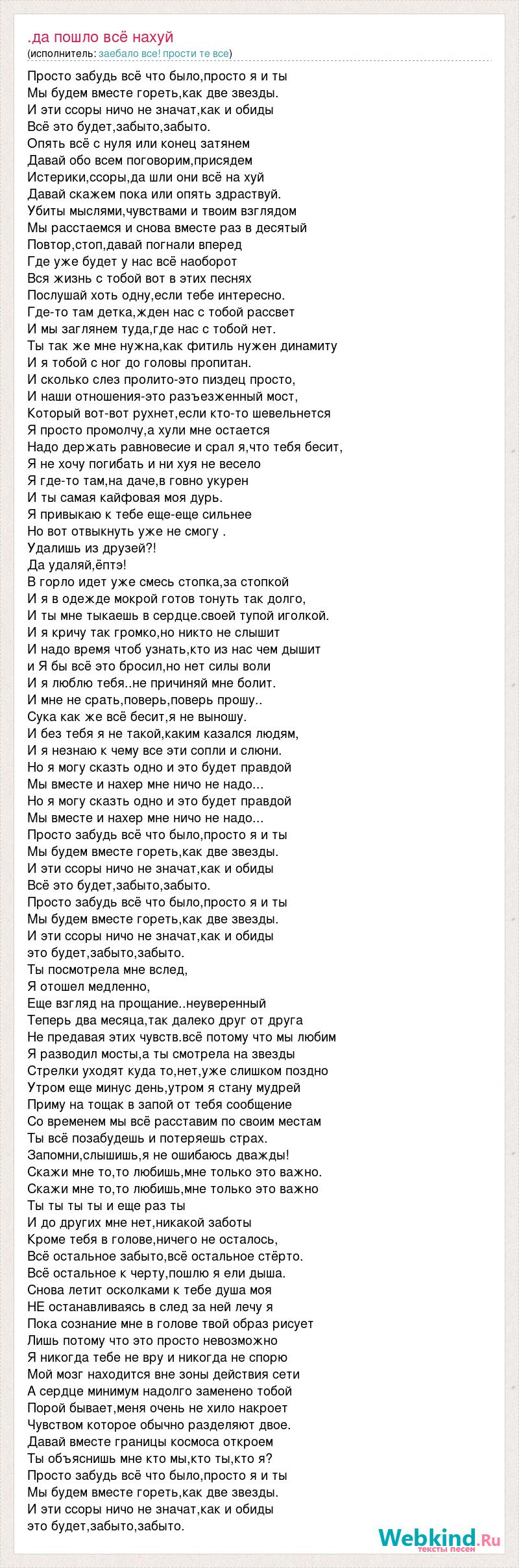 Просто забудь всё что было,просто я и ты Мы будем вместе гореть,как две звезды. И эти ссоры ничо не значат,как и обиды Всё это будет,забыто,забыто. Опять всё с нуля или конец затянем Давай обо всем поговорим,присядем Истерики,ссоры,да шли они всё на хуй Давай скажем пока или опять здраствуй. Убиты мыслями,чувствами и твоим взглядом Мы расстаемся и снова вместе раз в десятый Повтор,стоп,давай погнали вперед Где уже будет у нас всё наоборот Вся жизнь с тобой вот в этих песнях Послушай хоть одну,если тебе интересно. Где-то там детка,жден нас с тобой рассвет И мы заглянем туда,где нас с тобой нет. Ты так же мне нужна,как фитиль нужен динамиту И я тобой с ног до головы пропитан. И сколько слез пролито-это пиздец просто, И наши отношения-это разъезженный мост, Который вот-вот рухнет,если кто-то шевельнется Я просто промолчу,а хули мне остается Надо держать равновесие и срал я,что тебя бесит, Я не хочу погибать и ни хуя не весело Я где-то там,на даче,в говно укурен И ты самая кайфовая моя дурь. Я привыкаю к тебе еще-еще сильнее Но вот отвыкнуть уже не смогу . Удалишь из друзей?! Да удаляй,ёптэ! В горло идет уже смесь стопка,за стопкой И я в одежде мокрой готов тонуть так долго, И ты мне тыкаешь в сердце.своей тупой иголкой. И я кричу так громко,но никто не слышит И надо время чтоб узнать,кто из нас чем дышит и Я бы всё это бросил,но нет силы воли И я люблю тебя..не причиняй мне болит. И мне не срать,поверь,поверь прошу.. Сука как же всё бесит,я не выношу. И без тебя я не такой,каким казался людям, И я незнаю к чему все эти сопли и слюни. Но я могу сказть одно и это будет правдой Мы вместе и нахер мне ничо не надо... Но я могу сказть одно и это будет правдой Мы вместе и нахер мне ничо не надо... Просто забудь всё что было,просто я и ты Мы будем вместе гореть,как две звезды. И эти ссоры ничо не значат,как и обиды Всё это будет,забыто,забыто. Просто забудь всё что было,просто я и ты Мы будем вместе гореть,как две звезды. И эти ссоры ничо не значат,как и обиды это будет,забыто,забыто. Ты посмотрела мне вслед, Я отошел медленно, Еще взгляд на прощание..неуверенный Теперь два месяца,так далеко друг от друга Не предавая этих чувств.всё потому что мы любим Я разводил мосты,а ты смотрела на звезды Стрелки уходят куда то,нет,уже слишком поздно Утром еще минус день,утром я стану мудрей Приму на тощак в запой от тебя сообщение Со временем мы всё расставим по своим местам Ты всё позабудешь и потеряешь страх. Запомни,слышишь,я не ошибаюсь дважды! Скажи мне то,то любишь,мне только это важно. Скажи мне то,то любишь,мне только это важно Ты ты ты ты и еще раз ты И до других мне нет,никакой заботы Кроме тебя в голове,ничего не осталось, Всё остальное забыто,всё остальное стёрто. Всё остальное к черту,пошлю я ели дыша. Снова летит осколками к тебе душа моя НЕ останавливаясь в след за ней лечу я Пока сознание мне в голове твой образ рисует Лишь потому что это просто невозможно Я никогда тебе не вру и никогда не спорю Мой мозг находится вне зоны действия сети А сердце минимум надолго заменено тобой Порой бывает,меня очень не хило накроет Чувством которое обычно разделяют двое. Давай вместе границы космоса откроем Ты объяснишь мне кто мы,кто ты,кто я? Просто забудь всё что было,просто я и ты Мы будем вместе гореть,как две звезды. И эти ссоры ничо не значат,как и обиды это будет,забыто,забыто.