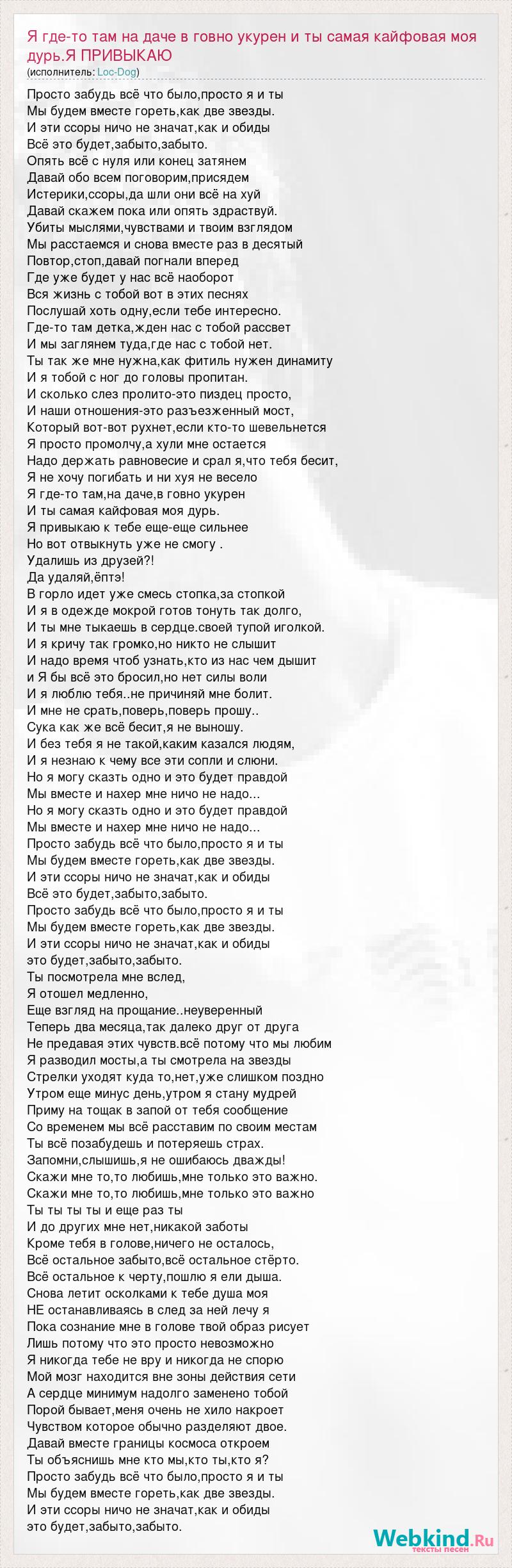 Просто забудь всё что было,просто я и ты Мы будем вместе гореть,как две звезды. И эти ссоры ничо не значат,как и обиды Всё это будет,забыто,забыто. Опять всё с нуля или конец затянем Давай обо всем поговорим,присядем Истерики,ссоры,да шли они всё на хуй Давай скажем пока или опять здраствуй. Убиты мыслями,чувствами и твоим взглядом Мы расстаемся и снова вместе раз в десятый Повтор,стоп,давай погнали вперед Где уже будет у нас всё наоборот Вся жизнь с тобой вот в этих песнях Послушай хоть одну,если тебе интересно. Где-то там детка,жден нас с тобой рассвет И мы заглянем туда,где нас с тобой нет. Ты так же мне нужна,как фитиль нужен динамиту И я тобой с ног до головы пропитан. И сколько слез пролито-это пиздец просто, И наши отношения-это разъезженный мост, Который вот-вот рухнет,если кто-то шевельнется Я просто промолчу,а хули мне остается Надо держать равновесие и срал я,что тебя бесит, Я не хочу погибать и ни хуя не весело Я где-то там,на даче,в говно укурен И ты самая кайфовая моя дурь. Я привыкаю к тебе еще-еще сильнее Но вот отвыкнуть уже не смогу . Удалишь из друзей?! Да удаляй,ёптэ! В горло идет уже смесь стопка,за стопкой И я в одежде мокрой готов тонуть так долго, И ты мне тыкаешь в сердце.своей тупой иголкой. И я кричу так громко,но никто не слышит И надо время чтоб узнать,кто из нас чем дышит и Я бы всё это бросил,но нет силы воли И я люблю тебя..не причиняй мне болит. И мне не срать,поверь,поверь прошу.. Сука как же всё бесит,я не выношу. И без тебя я не такой,каким казался людям, И я незнаю к чему все эти сопли и слюни. Но я могу сказть одно и это будет правдой Мы вместе и нахер мне ничо не надо... Но я могу сказть одно и это будет правдой Мы вместе и нахер мне ничо не надо... Просто забудь всё что было,просто я и ты Мы будем вместе гореть,как две звезды. И эти ссоры ничо не значат,как и обиды Всё это будет,забыто,забыто. Просто забудь всё что было,просто я и ты Мы будем вместе гореть,как две звезды. И эти ссоры ничо не значат,как и обиды это будет,забыто,забыто. Ты посмотрела мне вслед, Я отошел медленно, Еще взгляд на прощание..неуверенный Теперь два месяца,так далеко друг от друга Не предавая этих чувств.всё потому что мы любим Я разводил мосты,а ты смотрела на звезды Стрелки уходят куда то,нет,уже слишком поздно Утром еще минус день,утром я стану мудрей Приму на тощак в запой от тебя сообщение Со временем мы всё расставим по своим местам Ты всё позабудешь и потеряешь страх. Запомни,слышишь,я не ошибаюсь дважды! Скажи мне то,то любишь,мне только это важно. Скажи мне то,то любишь,мне только это важно Ты ты ты ты и еще раз ты И до других мне нет,никакой заботы Кроме тебя в голове,ничего не осталось, Всё остальное забыто,всё остальное стёрто. Всё остальное к черту,пошлю я ели дыша. Снова летит осколками к тебе душа моя НЕ останавливаясь в след за ней лечу я Пока сознание мне в голове твой образ рисует Лишь потому что это просто невозможно Я никогда тебе не вру и никогда не спорю Мой мозг находится вне зоны действия сети А сердце минимум надолго заменено тобой Порой бывает,меня очень не хило накроет Чувством которое обычно разделяют двое. Давай вместе границы космоса откроем Ты объяснишь мне кто мы,кто ты,кто я? Просто забудь всё что было,просто я и ты Мы будем вместе гореть,как две звезды. И эти ссоры ничо не значат,как и обиды это будет,забыто,забыто.