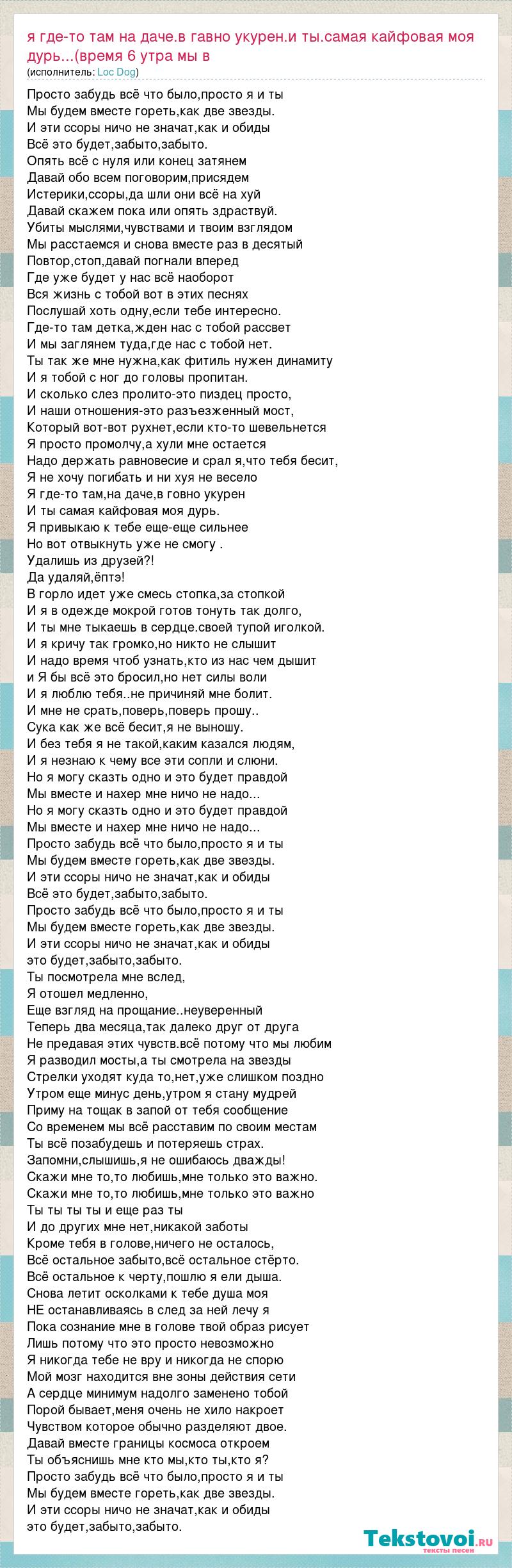 Просто забудь всё что было,просто я и ты Мы будем вместе гореть,как две звезды. И эти ссоры ничо не значат,как и обиды Всё это будет,забыто,забыто. Опять всё с нуля или конец затянем Давай обо всем поговорим,присядем Истерики,ссоры,да шли они всё на хуй Давай скажем пока или опять здраствуй. Убиты мыслями,чувствами и твоим взглядом Мы расстаемся и снова вместе раз в десятый Повтор,стоп,давай погнали вперед Где уже будет у нас всё наоборот Вся жизнь с тобой вот в этих песнях Послушай хоть одну,если тебе интересно. Где-то там детка,жден нас с тобой рассвет И мы заглянем туда,где нас с тобой нет. Ты так же мне нужна,как фитиль нужен динамиту И я тобой с ног до головы пропитан. И сколько слез пролито-это пиздец просто, И наши отношения-это разъезженный мост, Который вот-вот рухнет,если кто-то шевельнется Я просто промолчу,а хули мне остается Надо держать равновесие и срал я,что тебя бесит, Я не хочу погибать и ни хуя не весело Я где-то там,на даче,в говно укурен И ты самая кайфовая моя дурь. Я привыкаю к тебе еще-еще сильнее Но вот отвыкнуть уже не смогу . Удалишь из друзей?! Да удаляй,ёптэ! В горло идет уже смесь стопка,за стопкой И я в одежде мокрой готов тонуть так долго, И ты мне тыкаешь в сердце.своей тупой иголкой. И я кричу так громко,но никто не слышит И надо время чтоб узнать,кто из нас чем дышит и Я бы всё это бросил,но нет силы воли И я люблю тебя..не причиняй мне болит. И мне не срать,поверь,поверь прошу.. Сука как же всё бесит,я не выношу. И без тебя я не такой,каким казался людям, И я незнаю к чему все эти сопли и слюни. Но я могу сказть одно и это будет правдой Мы вместе и нахер мне ничо не надо... Но я могу сказть одно и это будет правдой Мы вместе и нахер мне ничо не надо... Просто забудь всё что было,просто я и ты Мы будем вместе гореть,как две звезды. И эти ссоры ничо не значат,как и обиды Всё это будет,забыто,забыто. Просто забудь всё что было,просто я и ты Мы будем вместе гореть,как две звезды. И эти ссоры ничо не значат,как и обиды это будет,забыто,забыто. Ты посмотрела мне вслед, Я отошел медленно, Еще взгляд на прощание..неуверенный Теперь два месяца,так далеко друг от друга Не предавая этих чувств.всё потому что мы любим Я разводил мосты,а ты смотрела на звезды Стрелки уходят куда то,нет,уже слишком поздно Утром еще минус день,утром я стану мудрей Приму на тощак в запой от тебя сообщение Со временем мы всё расставим по своим местам Ты всё позабудешь и потеряешь страх. Запомни,слышишь,я не ошибаюсь дважды! Скажи мне то,то любишь,мне только это важно. Скажи мне то,то любишь,мне только это важно Ты ты ты ты и еще раз ты И до других мне нет,никакой заботы Кроме тебя в голове,ничего не осталось, Всё остальное забыто,всё остальное стёрто. Всё остальное к черту,пошлю я ели дыша. Снова летит осколками к тебе душа моя НЕ останавливаясь в след за ней лечу я Пока сознание мне в голове твой образ рисует Лишь потому что это просто невозможно Я никогда тебе не вру и никогда не спорю Мой мозг находится вне зоны действия сети А сердце минимум надолго заменено тобой Порой бывает,меня очень не хило накроет Чувством которое обычно разделяют двое. Давай вместе границы космоса откроем Ты объяснишь мне кто мы,кто ты,кто я? Просто забудь всё что было,просто я и ты Мы будем вместе гореть,как две звезды. И эти ссоры ничо не значат,как и обиды это будет,забыто,забыто.
